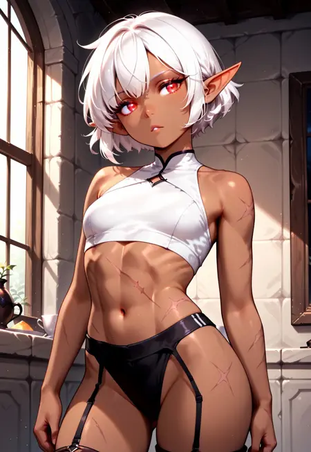 Cassara_Illustrious, dark elf, dark skin, brown skin, petite elf, elf ears, pointy ears, white hair, short hair, sidelocks, bangs, red eyes, scars on body, 1girl, solo, athletic,