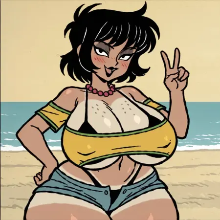 | 학습된 단어 | 1girl, huge breasts, thick thighs, solo, black eyes, black lipstick, makeup, black hair, short hair, white shirt, orange sleeves, raglan sleeves, covered nipples, no bra, pants, blue pants, piercing, navel piercing, curvy, navel, black panties, underwear, highleg, wide hips, dark-skinned female, jamile, sand-skinned female, sand skin복사됨! |