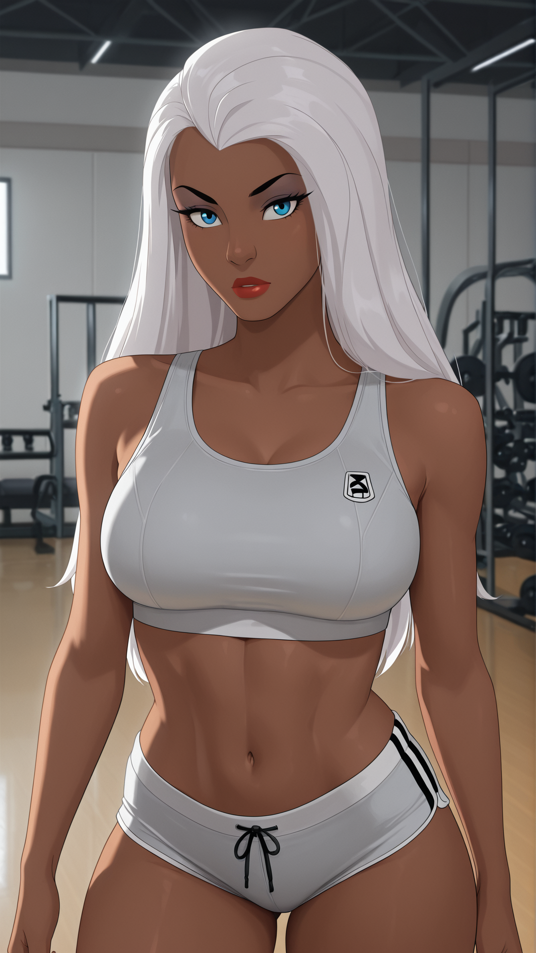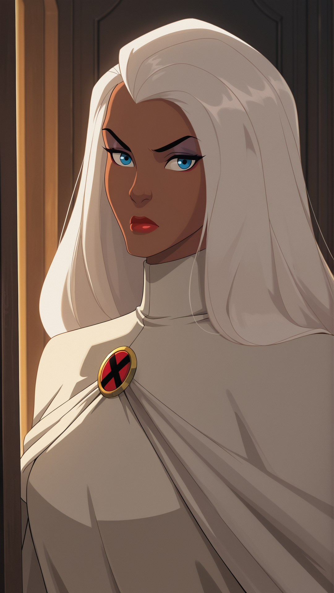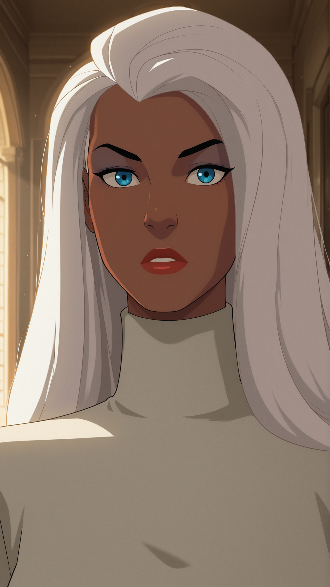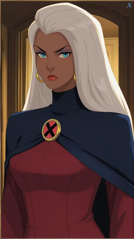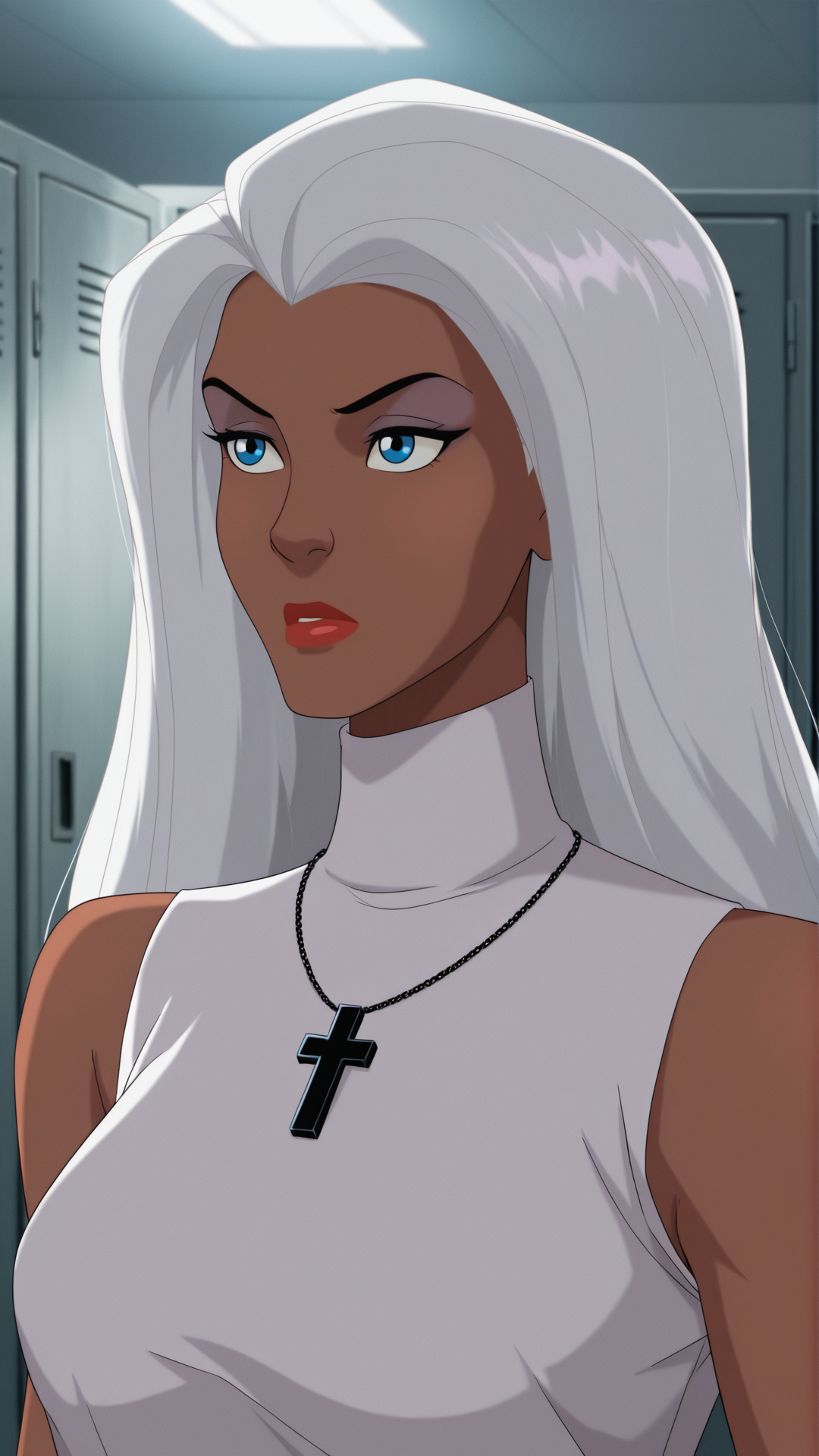 Storm_XL, white hair, blue eyes, dark skin, dark skinned female, makeup, eyeshadow, lipstick, red lips,