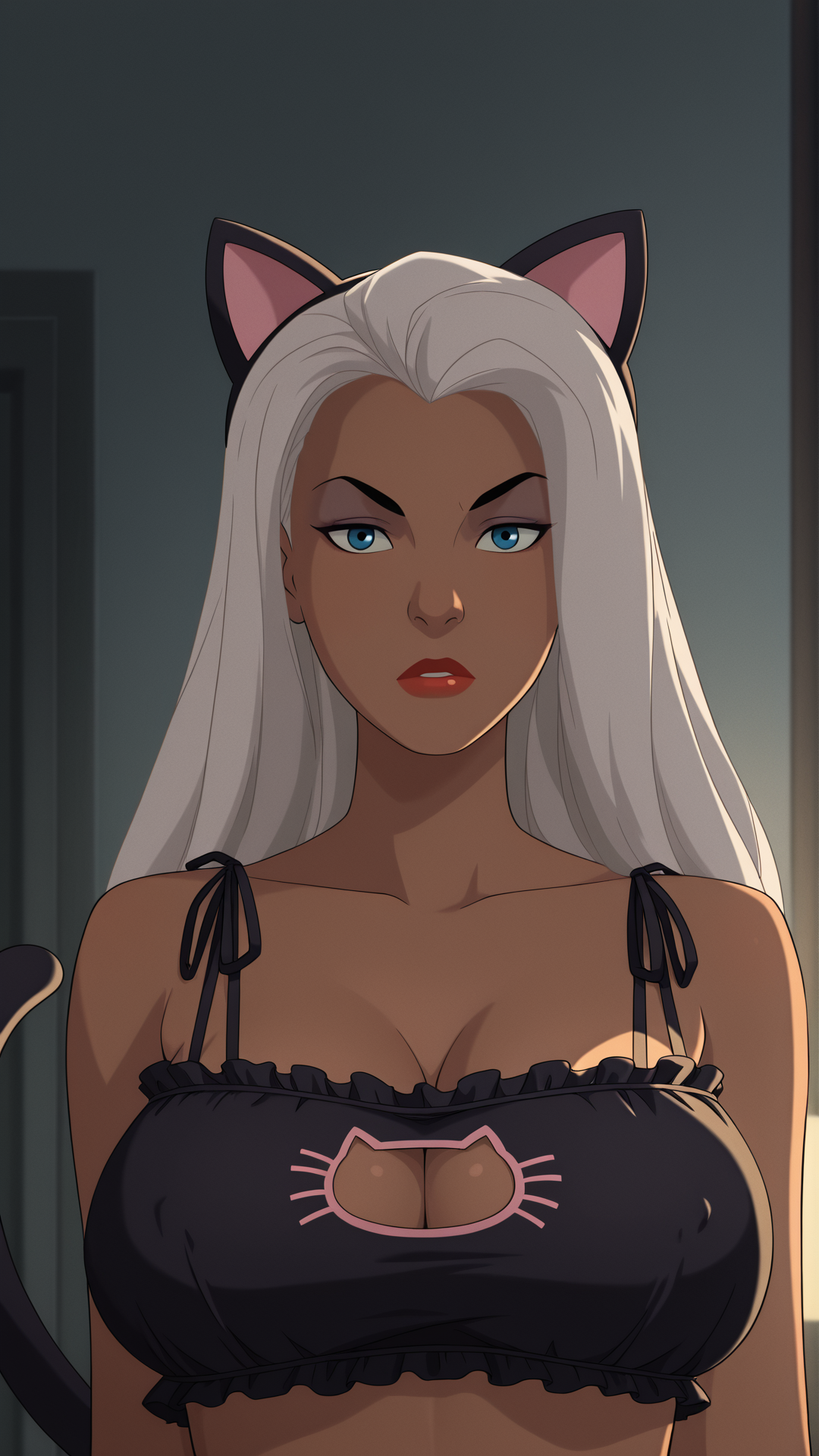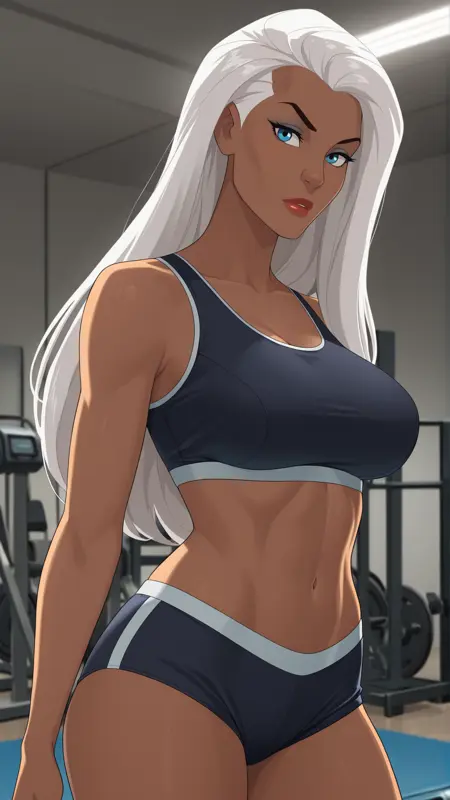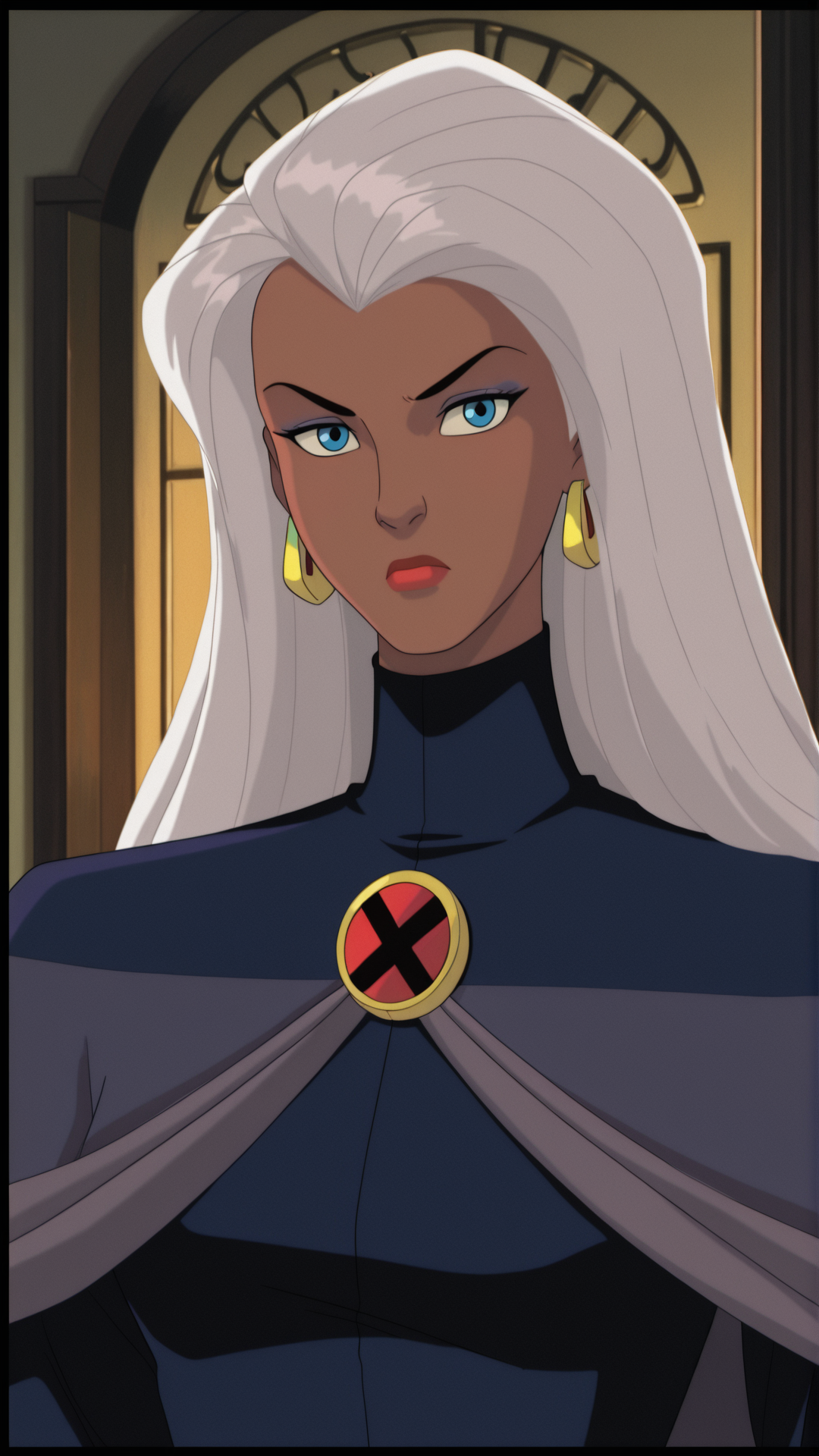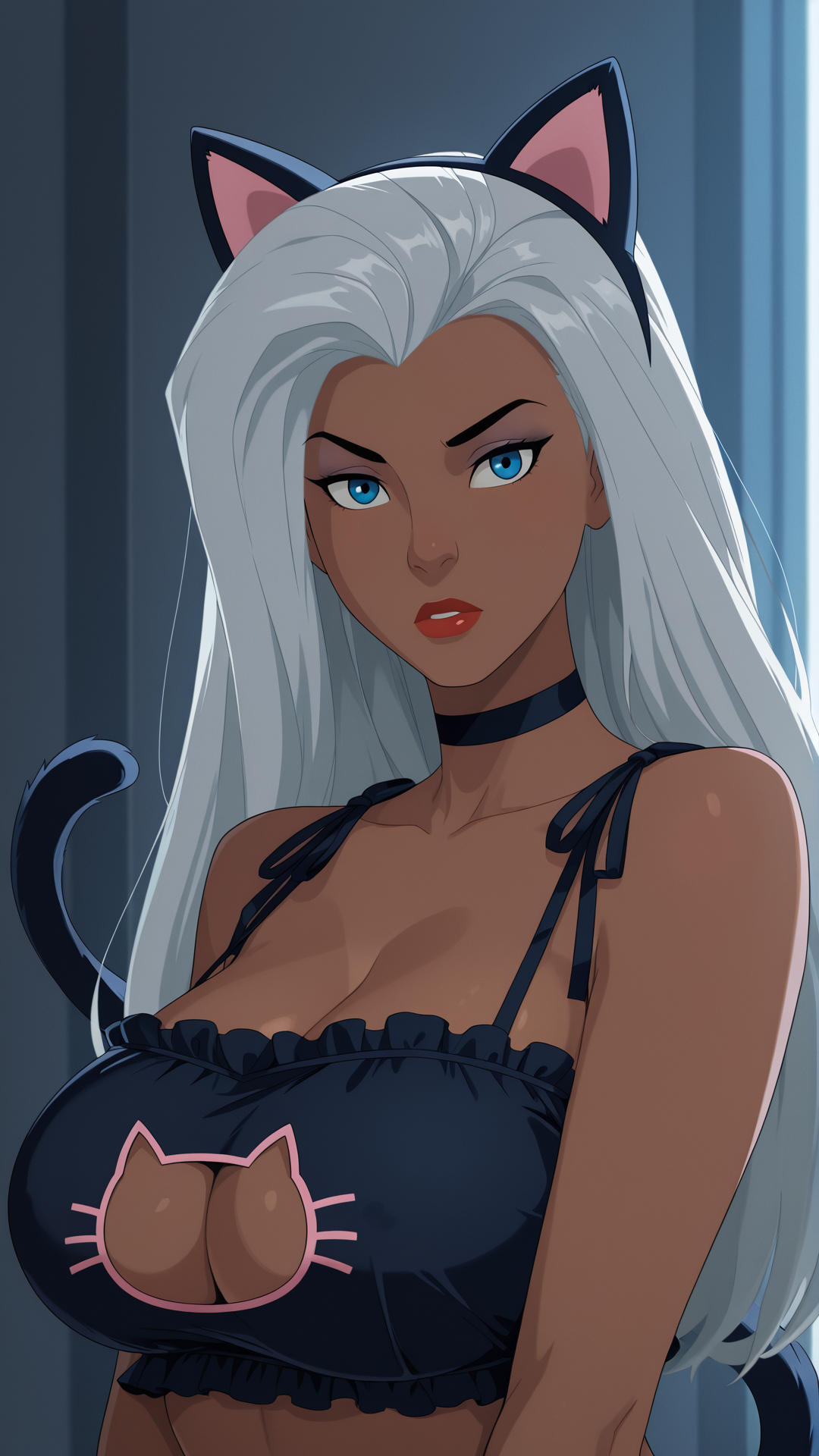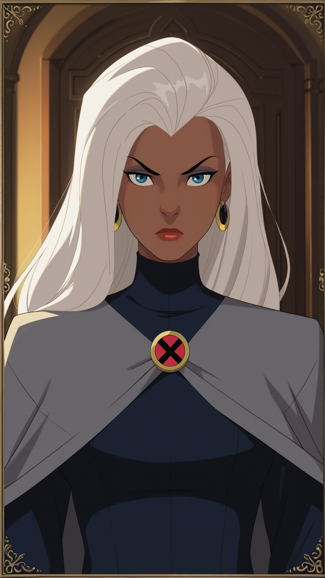 Storm_XL, white hair, blue eyes, dark skin, dark skinned female, makeup, eyeshadow, lipstick, red lips,