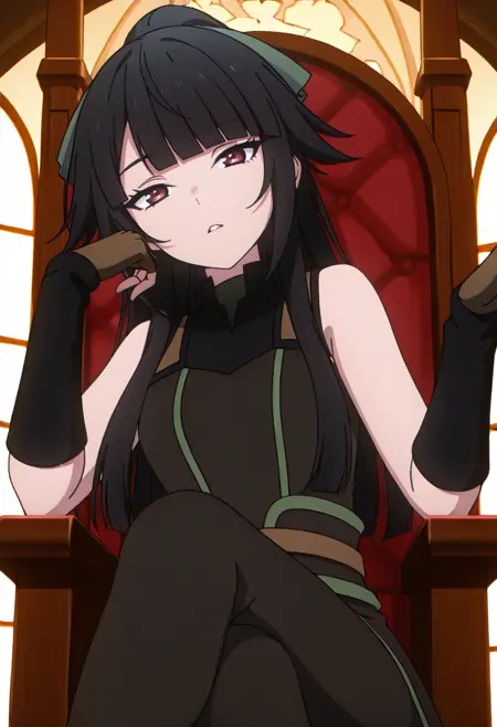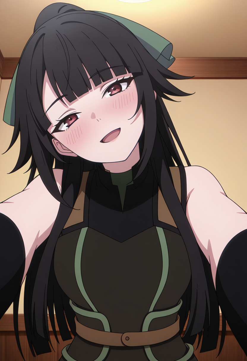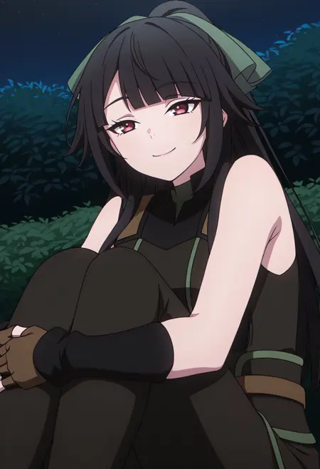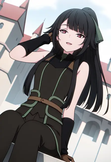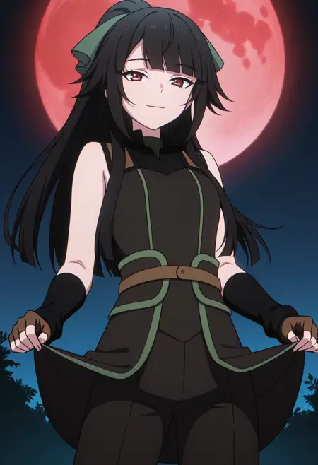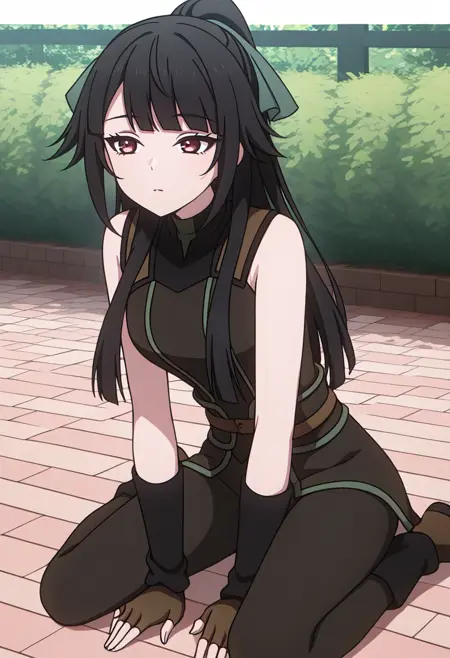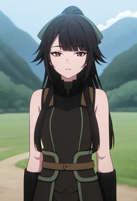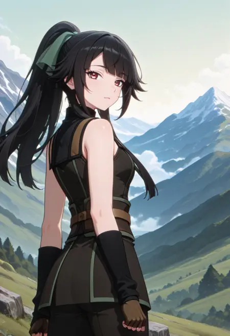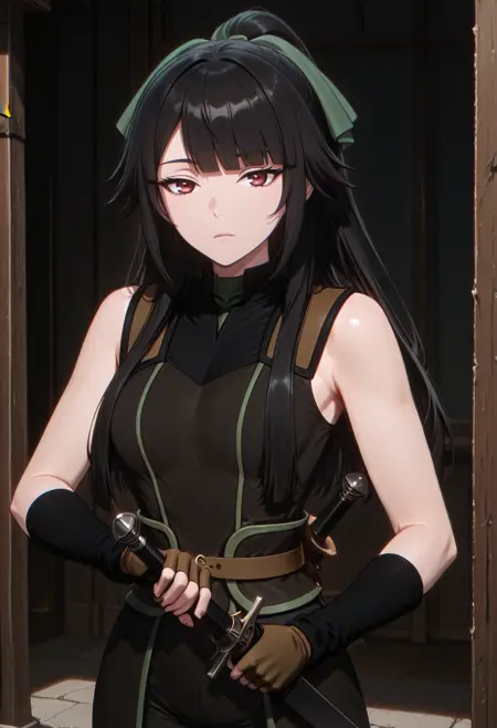 | 학습된 단어 | 1girl, long black hair, bangs, high ponytail, green ribbon, red eyes, medium breast, | dark outfit |,green trim, green accents, brown belt, cinched waist, sleeveless top, high collar, turtleneck, arm warmers, elbow length gloves, fingerless gloves, form-fitting, black long pants,복사됨! |