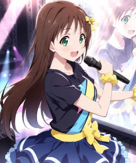 idol costume1, hair ornament, black shirt, short sleeves, wrist scrunchie, yellow scrunchie, blue skirt, ribbon, frills, white socks, black footwear,