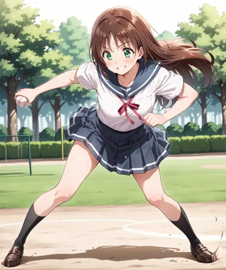 sumika, green eyes, long hair, brown hair,