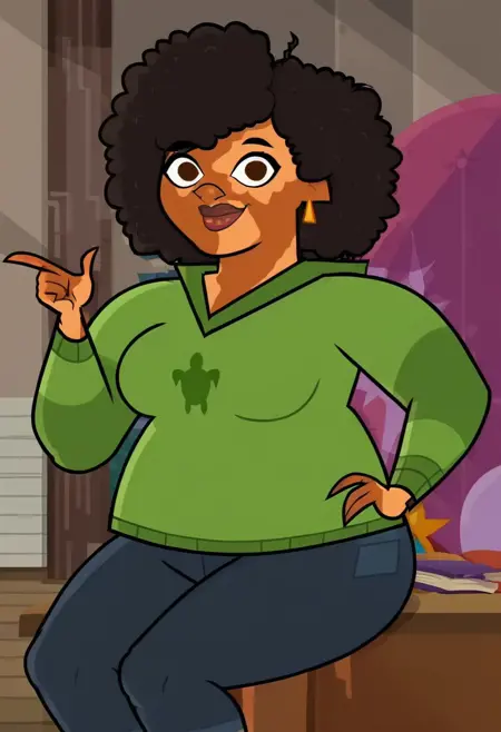 1girl, solo, Jade_DC, dark brown skin, vitiligo, dark brown eyes, black hair, fluffy afro hair, lipstick, chubby build