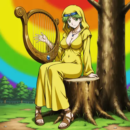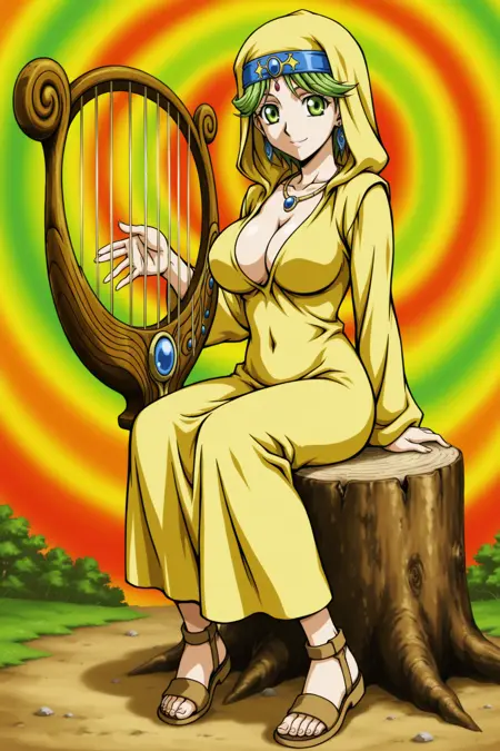 yugioh_card_style, yugioh_card_for_spirit_of_the_harp, green eyes, green hair, short hair, side part, earrings, necklace, headband, circlet, blue gem headband, large breasts, head covering, collarbone, covered navel, cleavage, smile, hooded robe, yellow robe, draped clothing, long sleeves, simple design, visible toenails, open-toed footwear, playing instrument, fantasy harp, sitting on tree stump, tree furniture, rainbow swirl background, looking_at_viewer