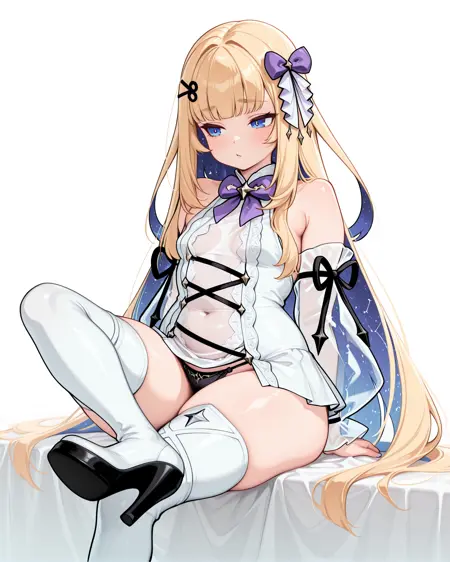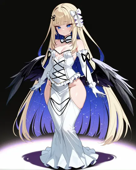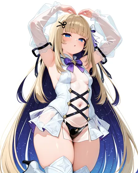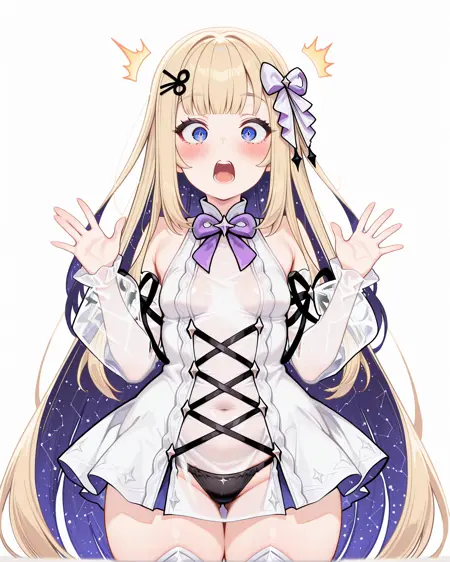 | 训练词汇 | ShiiBase, blonde hair, two tone hair, galaxy colored inner hair, blue eyes, very long hair, hair ornament, hair ribbon, purple bow, white dress, black straps, see-through center opening, covered navel, black panties, black ribbons, transparent detached sleeves, white thigh boots, high heel boots,已复制! CrabHoodie, blonde hair, two tone hair, galaxy colored inner hair, blue eyes, sidelocks, red hoodie, oversize hoodie, hood up, crab fake gloves claws, white thighhighs, toeless legwear,已复制! holding stuffed animal, giant bee stuffed animal,已复制! |