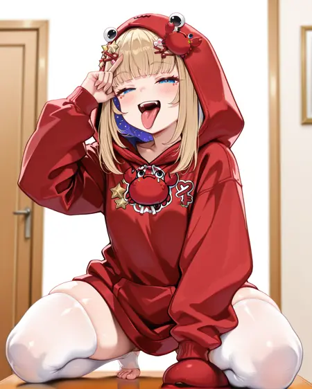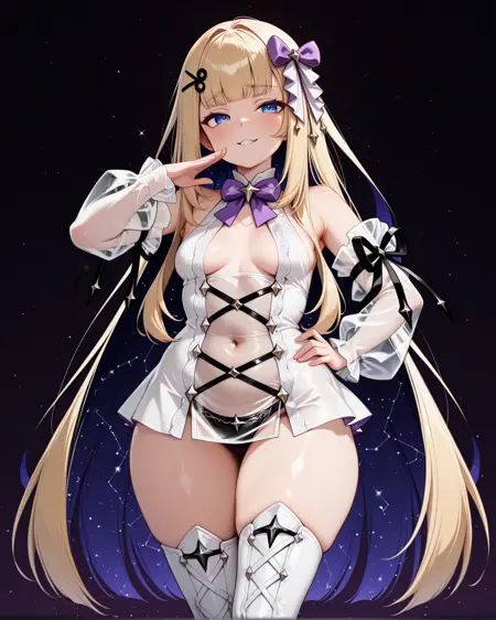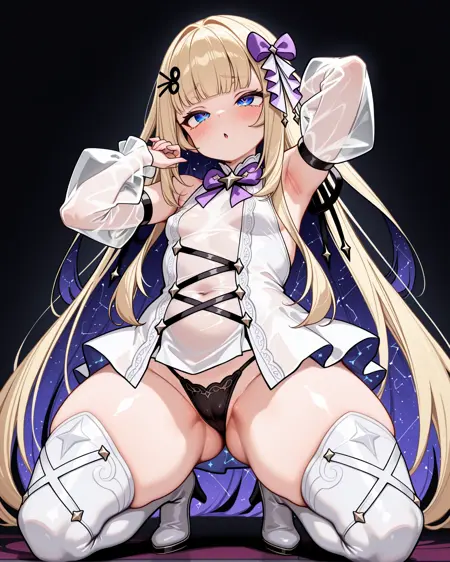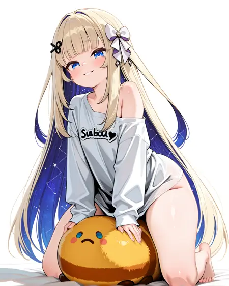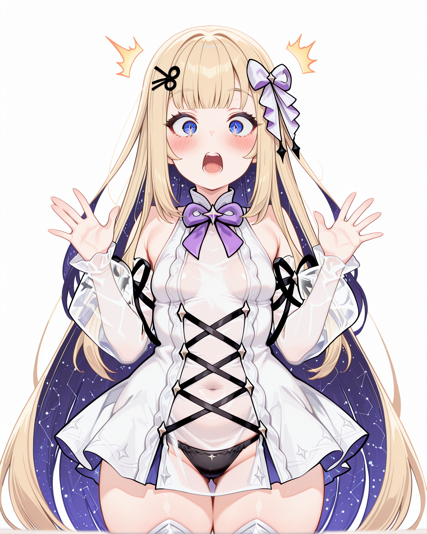 | トレーニングワード | ShiiBase, blonde hair, two tone hair, galaxy colored inner hair, blue eyes, very long hair, hair ornament, hair ribbon, purple bow, white dress, black straps, see-through center opening, covered navel, black panties, black ribbons, transparent detached sleeves, white thigh boots, high heel boots,コピーしました! CrabHoodie, blonde hair, two tone hair, galaxy colored inner hair, blue eyes, sidelocks, red hoodie, oversize hoodie, hood up, crab fake gloves claws, white thighhighs, toeless legwear,コピーしました! holding stuffed animal, giant bee stuffed animal,コピーしました! |