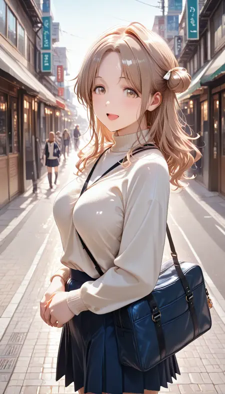 IMIchiHina, 긴 머리, 가슴, 큰 가슴, 갈색 머리, 중간 크기 가슴, 갈색 눈, 머리 리본, 머리 뭉치, 갈라진 앞머리, 연한 갈색 머리, 단일 머리 뭉치, 흰색 리본, 한쪽 머리 뭉치,