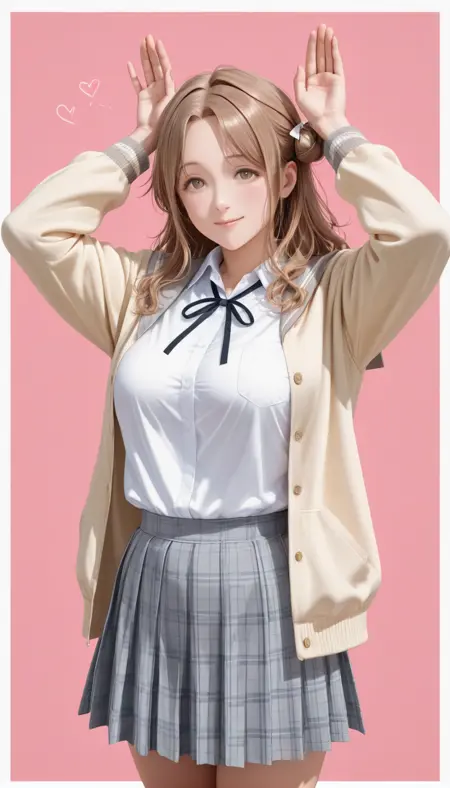 셔츠, 치마, 긴 소매, 학교 제복, 흰색 셔츠, 주름치마, 오픈 의상, 칼라 셔츠, 해적 칼라, 미니 스커트, 체크 무늬, 목 리본, 검은 리본, 체크 스커트, 카디건, 회색 스커트, 오픈 카디건, 회색 해적 칼라, 노란 카디건, 바지 셔츠, 가슴 주머니, 단추, 손목보다 긴 소매,