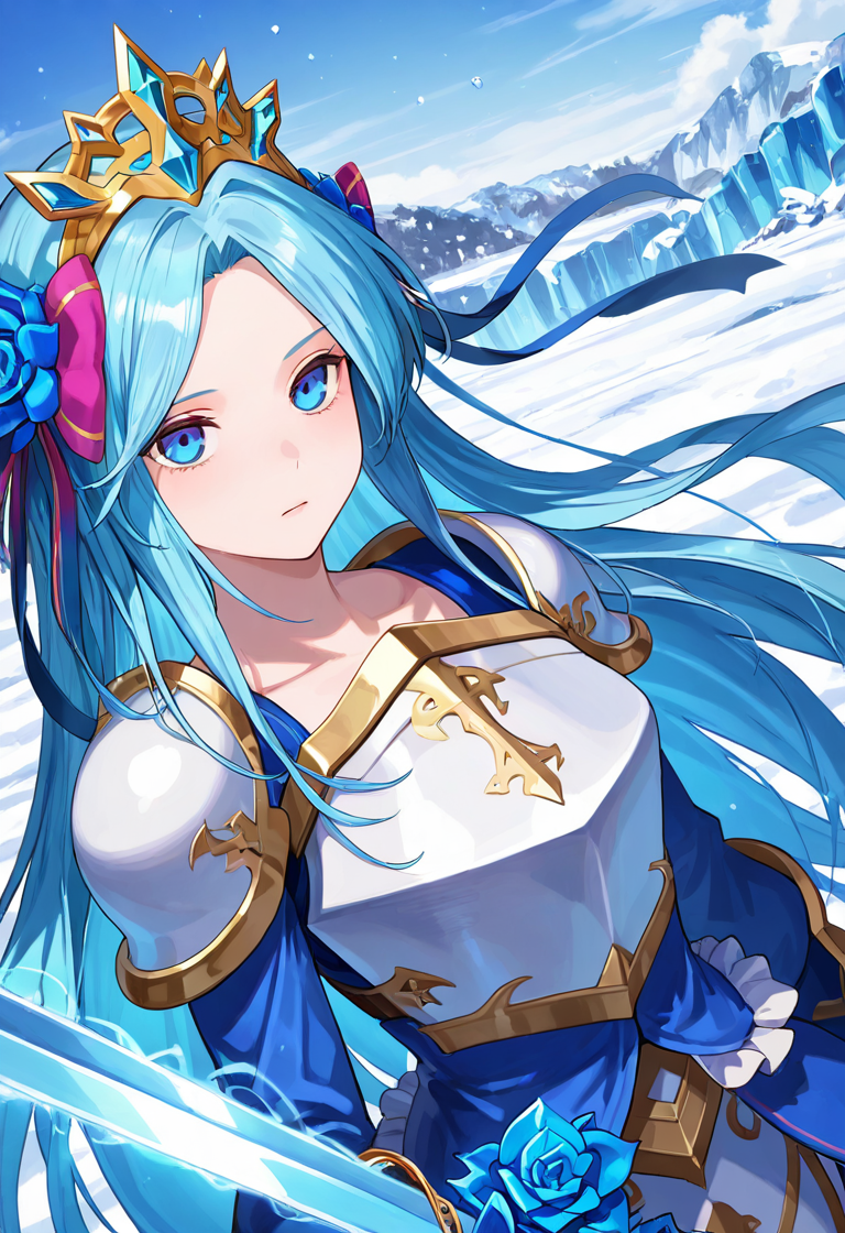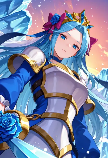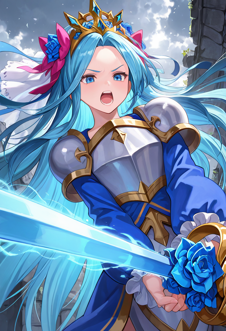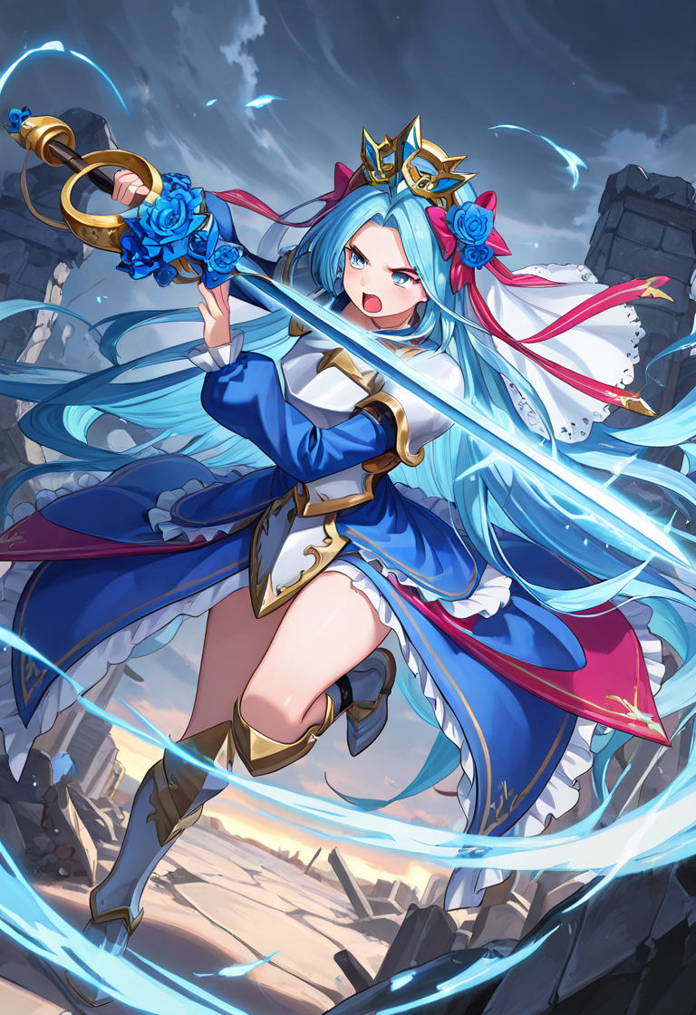 selena_(brave_frontier), 1girl, solo, 蓝色头发, 长发, 蓝色眼睛, 发饰, 蝴蝶结, 王冠, 头纱, 蓝色连衣裙, 护甲, 甲胄连衣裙, 高跟鞋, 带跟靴子, 甲胄靴, 玫瑰, 蓝色玫瑰, 护肩