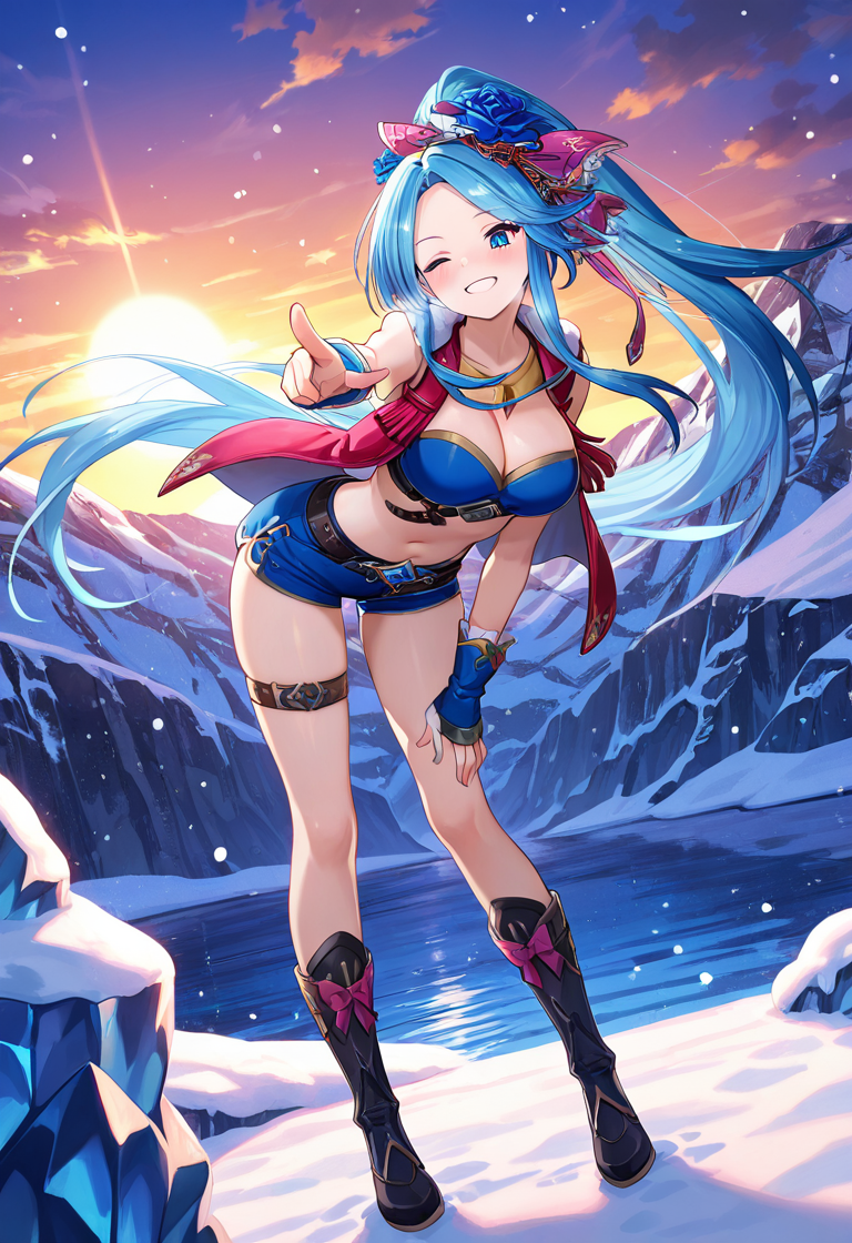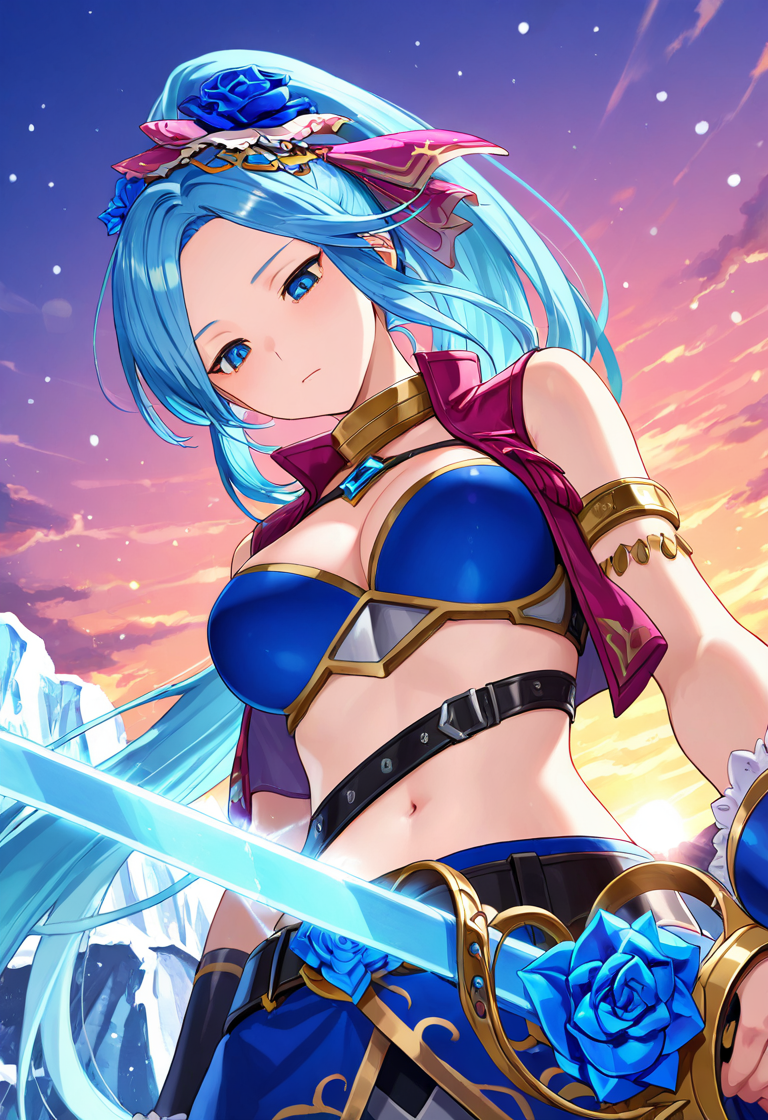 selena_(brave_frontier), 1girl, solo, 蓝色头发, 极长发, 蓝色眼睛, 马尾, 高马尾, 发饰, 蝴蝶结, 背心, 外套, 黄色围巾, 无袖, 臂环, 蓝色短裤, 露腹, 肚脐, 胸部露出, 玫瑰, 蓝色玫瑰,