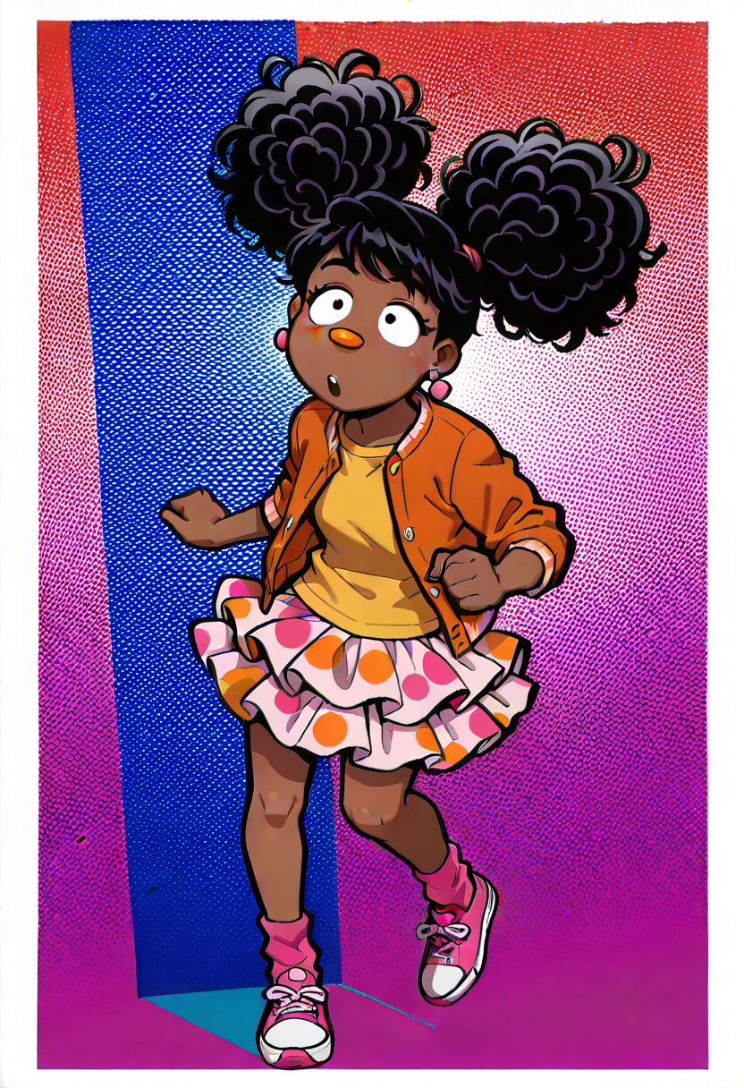 GabrielleSS, 1girl, dark skinned female, large curly black hair styled in two puffs, black eyes, magenta eyelids, pink earrings, bright orange jacket, yellow shirt, colorful layered ruffled skirt, pink shoes, light pink socks, bright orange nose