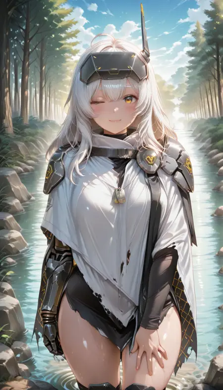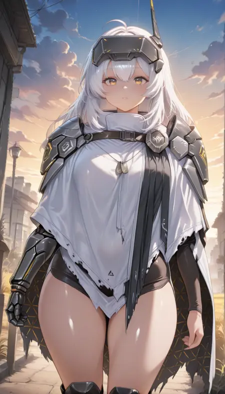 thighs, cape, armor, torn clothes, headgear, shoulder armor, cloak, white cape, dog tags, single mechanical arm, single cyborg hand, asymmetrical sleeves, single sleeve, long sleeve, black sleeve, white cloak, head-mounted display, visor (armor), jewelry, necklace, thick thighs, poncho, single glove, fingerless glove, elbow glove, boots, black footwear, armored boots, single head antenna, knee boots,