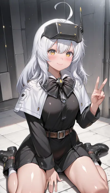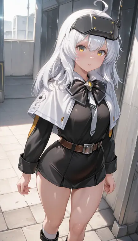 shirt, skirt, long sleeves, dress, bow, ahoge, thighs, boots, shorts, socks, belt, bowtie, black footwear, black shirt, bare legs, black bow, capelet, white socks, black bowtie, ankle boots, white capelet, white cloak, head-mounted display, visor (armor), brown belt, single head antenna,