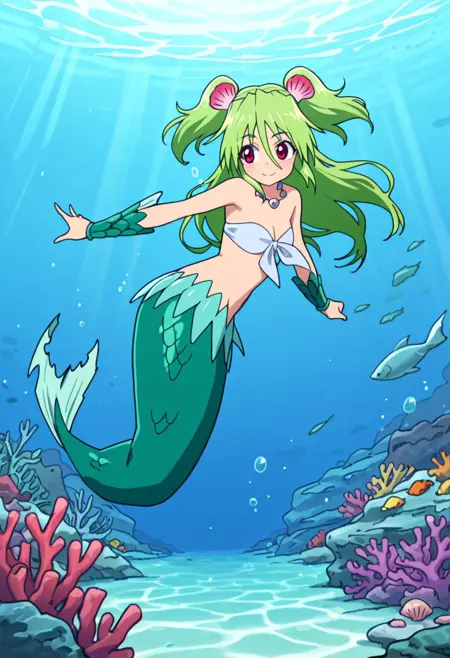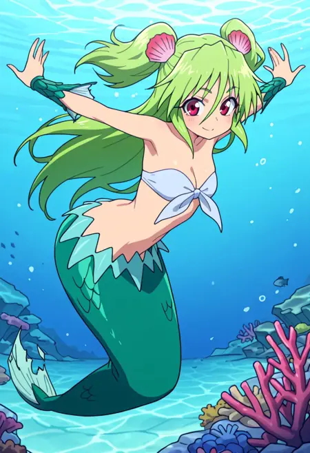 过去外观:穆洛米酱(过去),绿发,红眼,低双马尾,发丝遮眼,贝壳,发饰,海藻比基尼,露腹,怪物女孩,美人鱼,鱼尾,绿色鱼尾,鳞片状前臂