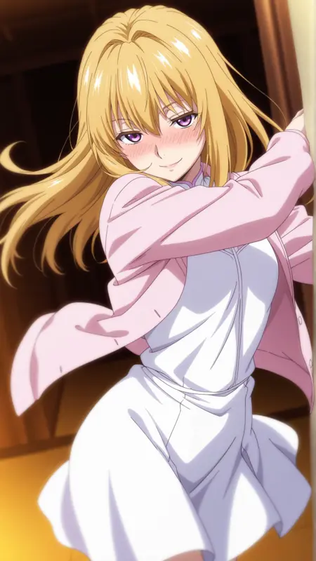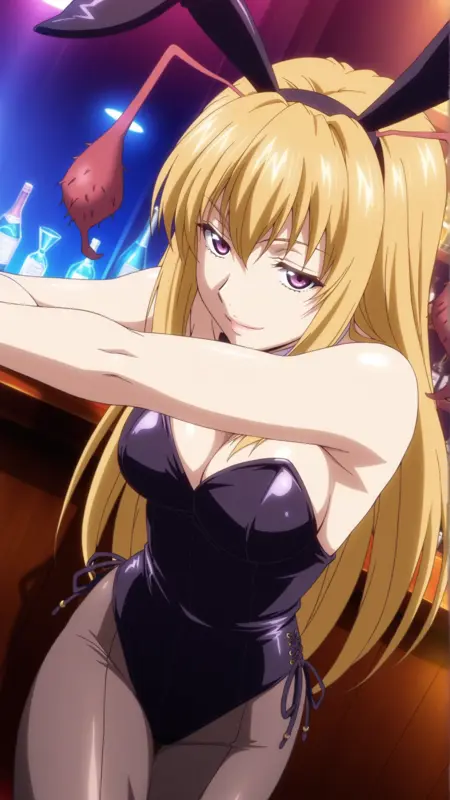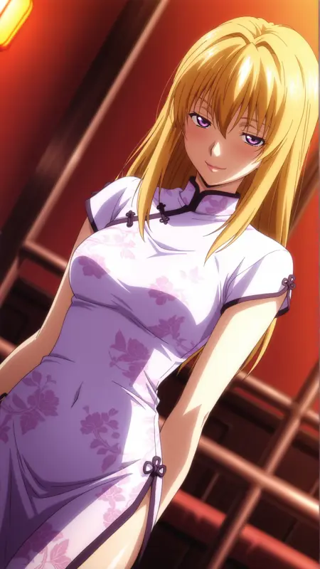 외모: 긴 머리, 금발, 보라색 눈,