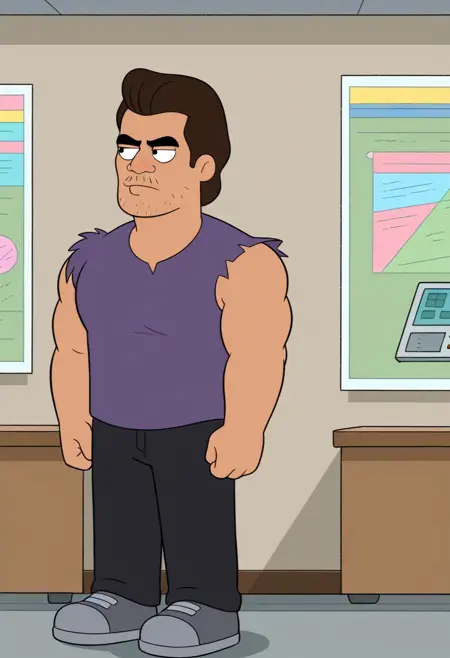 1boy,solo,Luiz Ramirez,muscular,teen boy,brown skin,short hair,brown hair,slicked hair,thick eyebrows,mustache,facial hair,torn clothes,sleeveless purple shirt,black pants,grey shoes