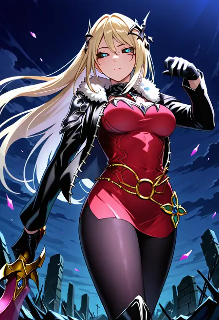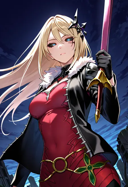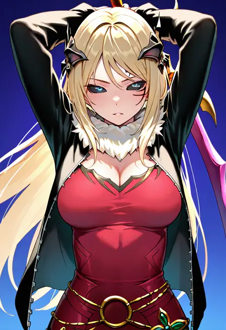 feeva_(brave_frontier), 1girl, solo, 금발, 긴 머리, 머리 장식, 파란 눈, 색상 홍채, 검은 홍채, 얼굴 문신, 빨간 셔츠, 검은 재킷, 벌어진 재킷, 모피 트림 재킷, 검은 장갑, 벨트, 금색 체인 벨트, 검은 바지, 검은 부츠, 금색 트림 부츠