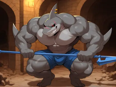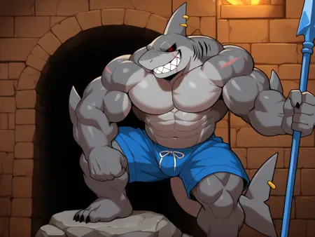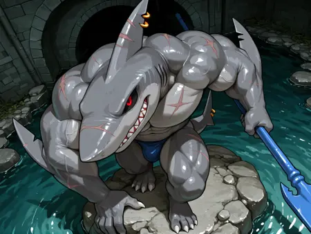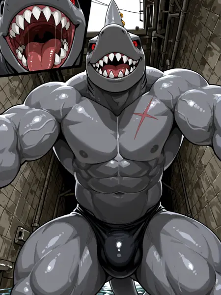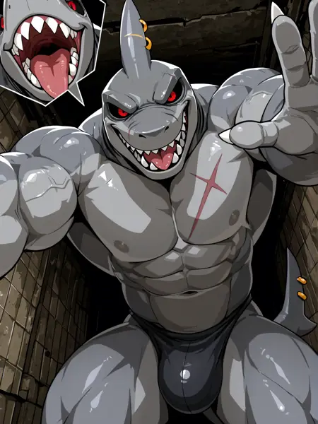 bl00dn0s3, shark, muscular male, grey skin, red eyes, black sclera, scar on face, scar on mouth, sharp teeth, nostrils, shark fin, fin scar, fin piercing, gills, white claws, sharp toenails nostrils, shark tail, tail piercing, claws, sharp toenails