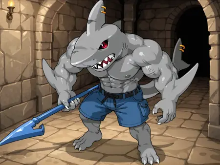 bl00dn0s3, shark, muscular male, grey skin, red eyes, black sclera, scar on face, scar on mouth, sharp teeth, nostrils, shark fin, fin scar, fin piercing, gills, white claws, sharp toenails nostrils, shark tail, tail piercing, claws, sharp toenails