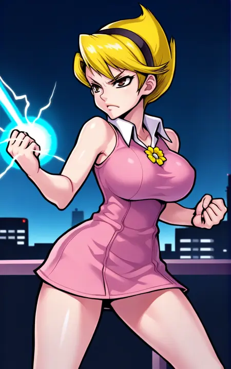 강화 태그: 금발, 단발, 갈색 눈, 싫어하는 표정