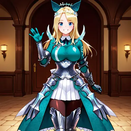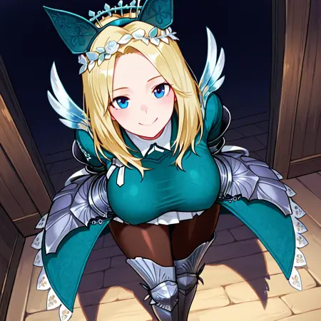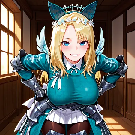 Vindictus_Delia, 1girl, solo, hair ornament, head wreath, fake animal ears, blonde hair, long hair, large breasts, blue eyes, taut clothes, armor, vambraces, gauntlets, armored dress, skirt, pantyhose, armored boots