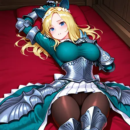 Vindictus_Delia, 1girl, solo, hair ornament, head wreath, fake animal ears, blonde hair, long hair, large breasts, blue eyes, taut clothes, armor, vambraces, gauntlets, armored dress, skirt, pantyhose, armored boots