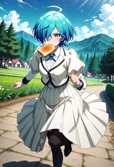 Character clothing: dress skirt, white skirt, long skirt, pleated skirt, white jacket, collered shirt, frills, long sleeves, puffy sleeves, juliet sleeves, black thighhighs, black highheels, blue brooch, small breasts,