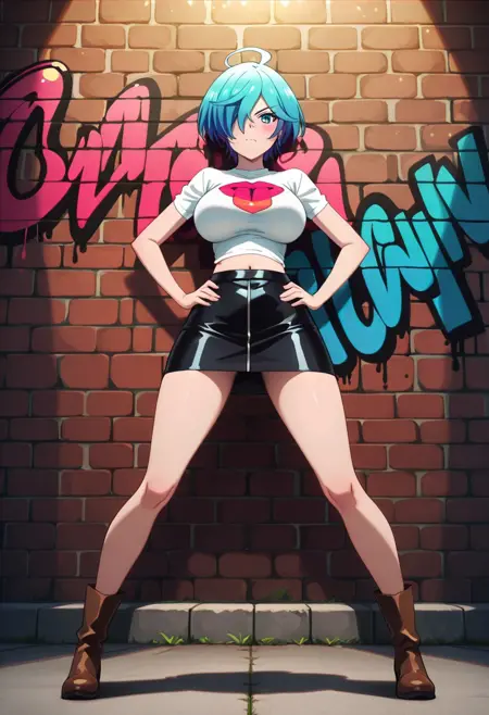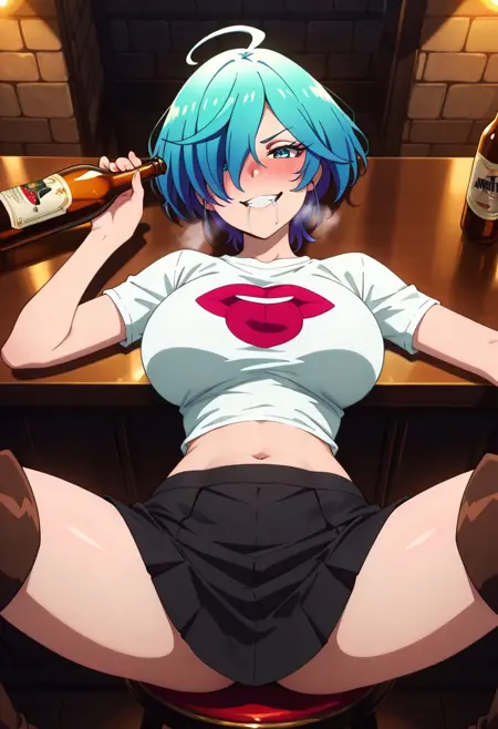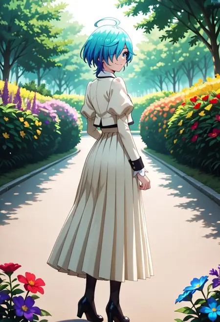 Character appearance: blue hair, short hair, ahoge, hair over one eye, blue eyes,
