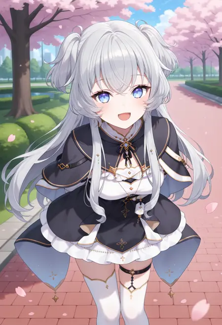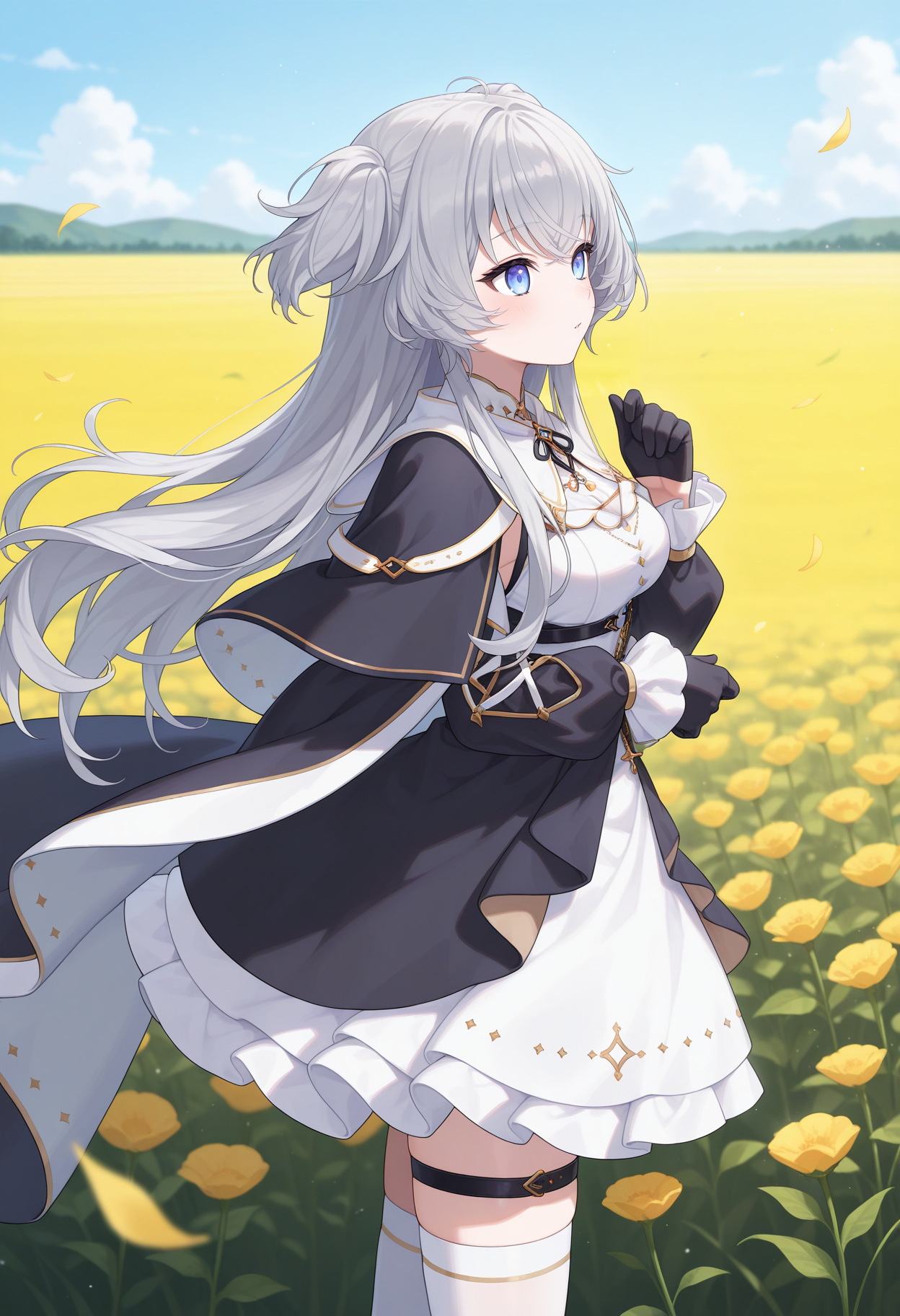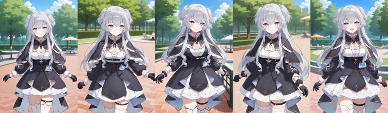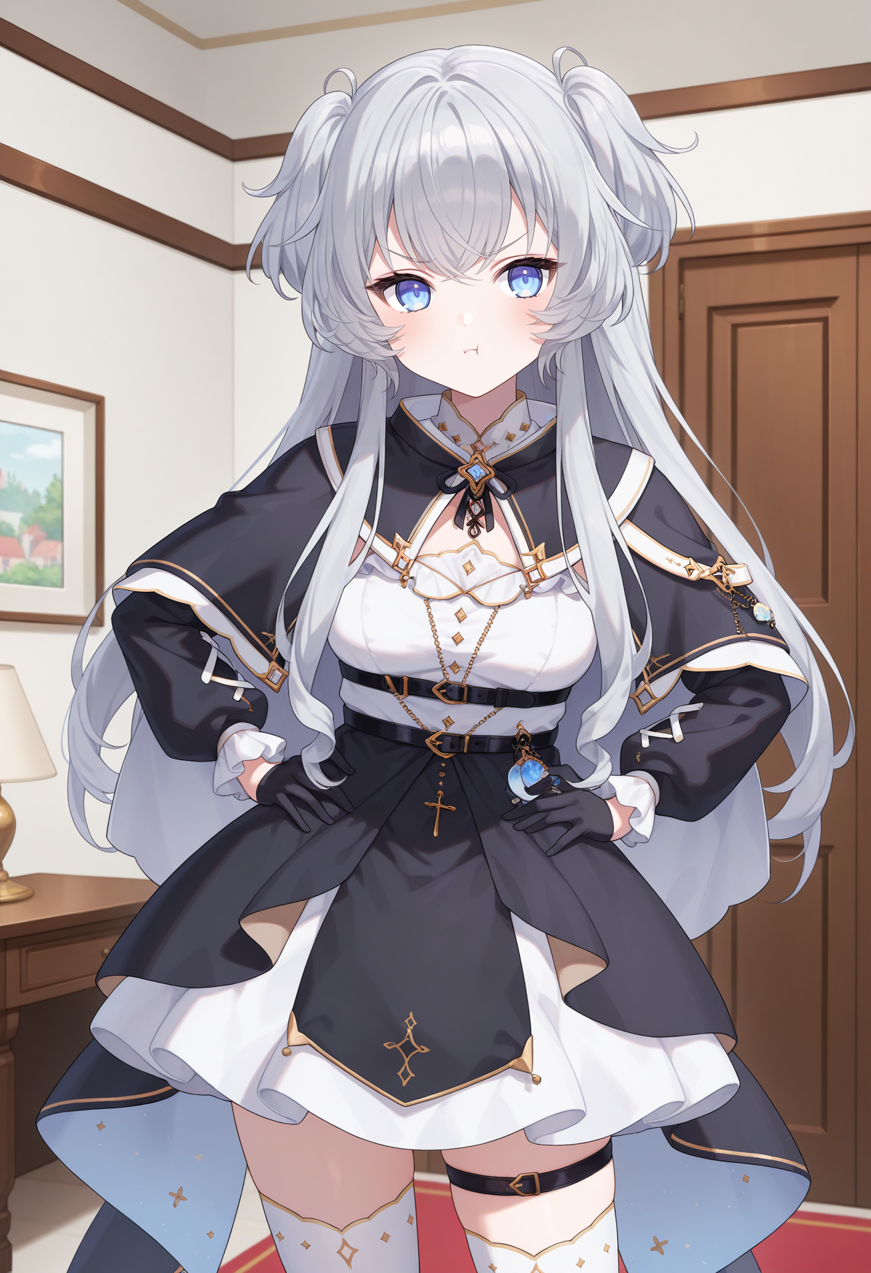 outfit1-1 (without habit)aaciel, long hair, grey hair, two side up, blue eyes, black capelet, neck ribbon, black dress, black gloves, white skirt, thigh strap, white thighhighs