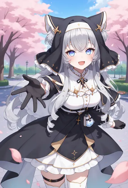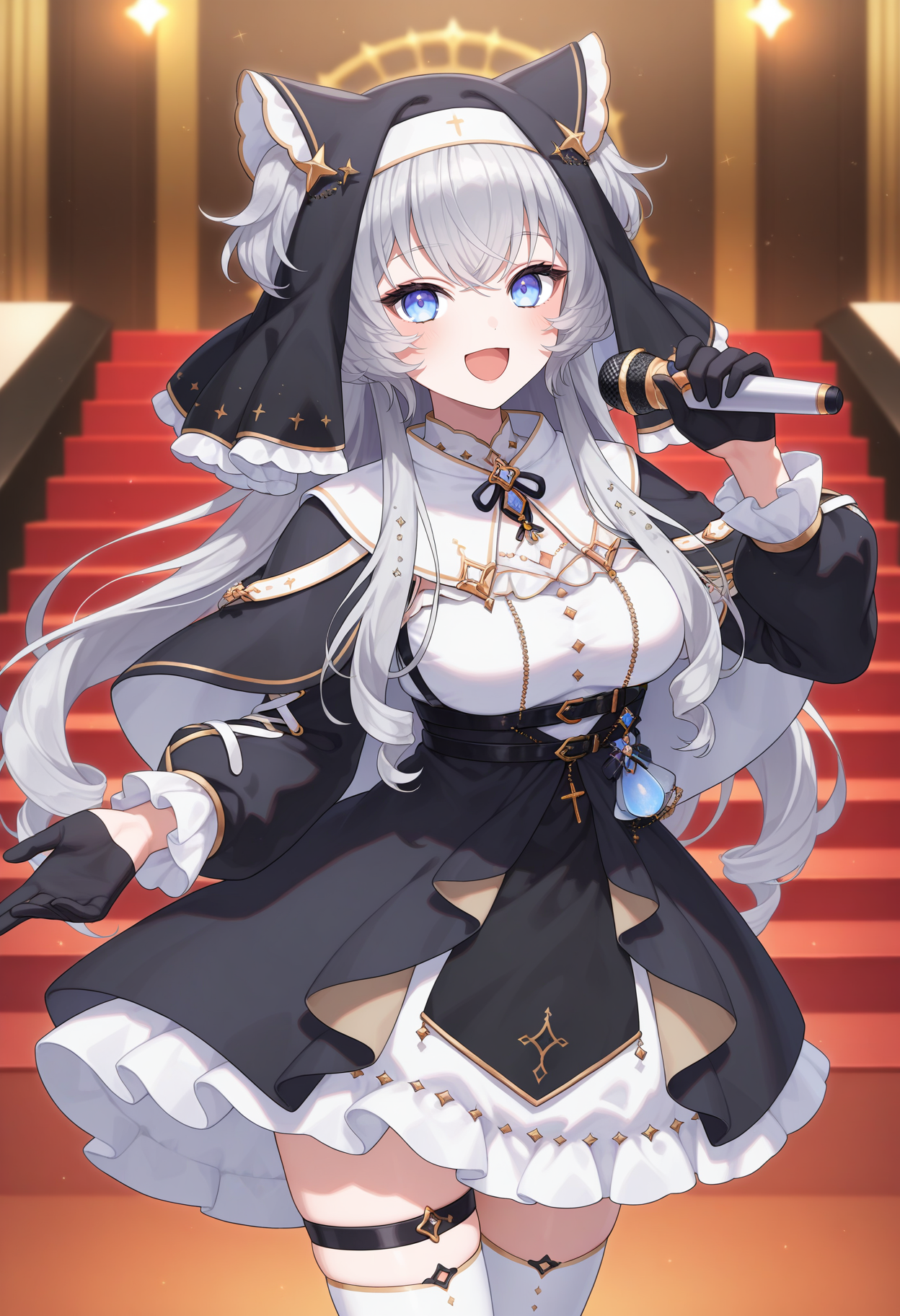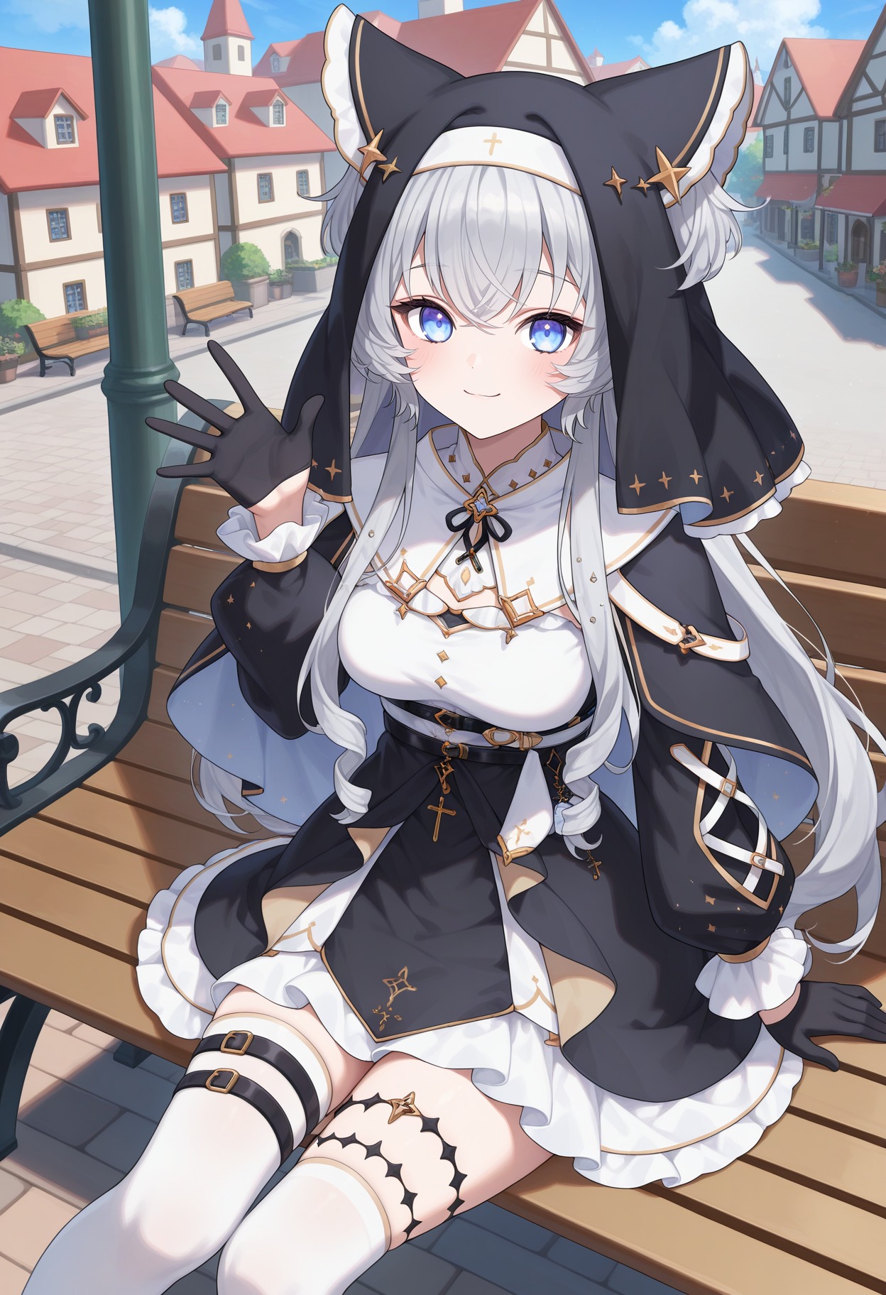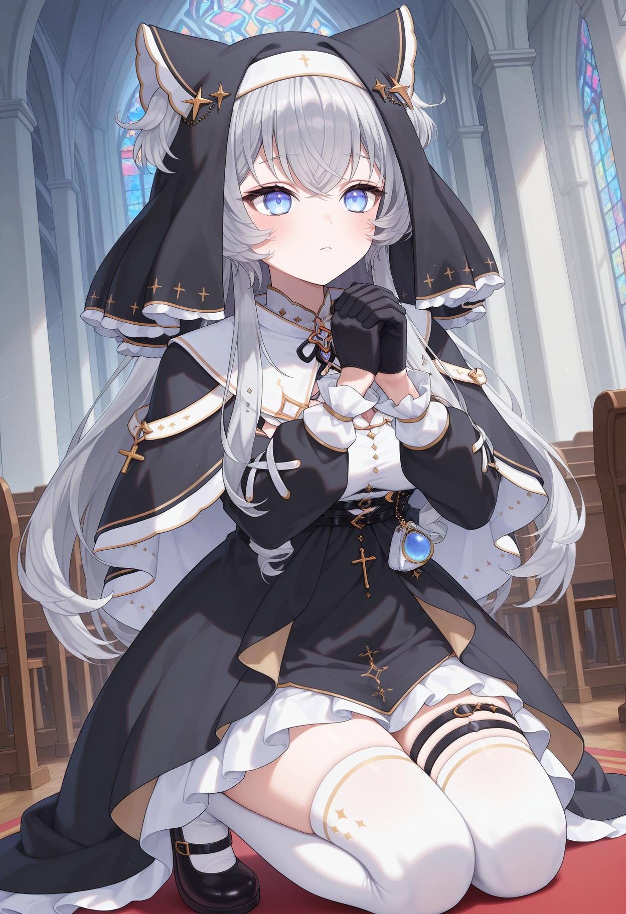 outfit1aaciel, long hair, grey hair, habit, blue eyes, black capelet, neck ribbon, black dress, black gloves, white skirt, thigh strap, white thighhighs