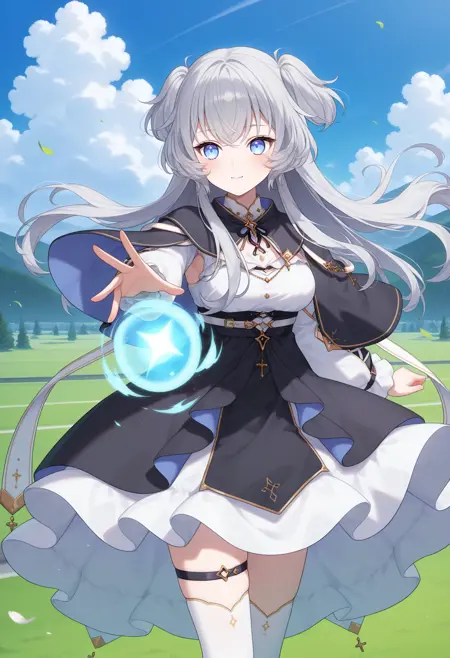outfit1-1 (habitなし)aaciel, long hair, grey hair, two side up, blue eyes, black capelet, neck ribbon, black dress, black gloves, white skirt, thigh strap, white thighhighs