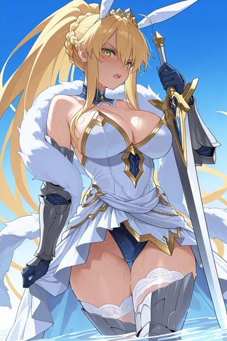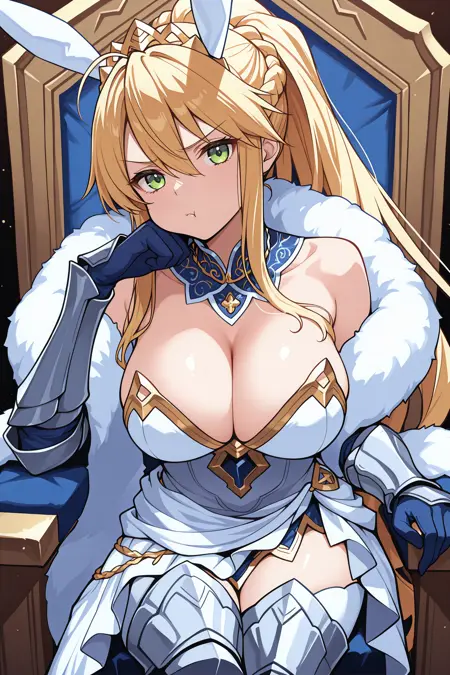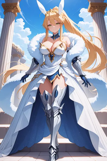 2단계 각성: "3aatrl, 금발, 옆머리, 프렌치 브레이드, 눈 사이 머리카락, 아호게, 녹색 눈, 높은 꼬리, 매우 긴 머리, 금 관모, 가짜 동물 귀, 토끼 귀, 파란 칼라, 레이스 칼라, 흰 드레스, 어깨 노출 드레스, 깃털 털목, 흉부 노출, 장갑, 파란 장갑, 흰 쇼걸 치마, 갑옷형 하의, 흰 허벅지 스타킹" 추가.