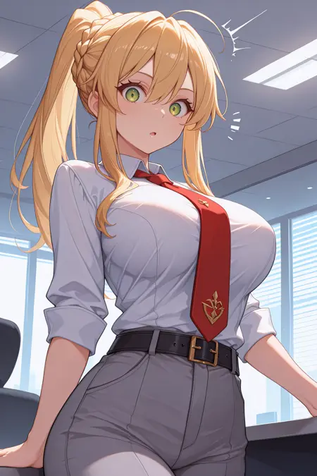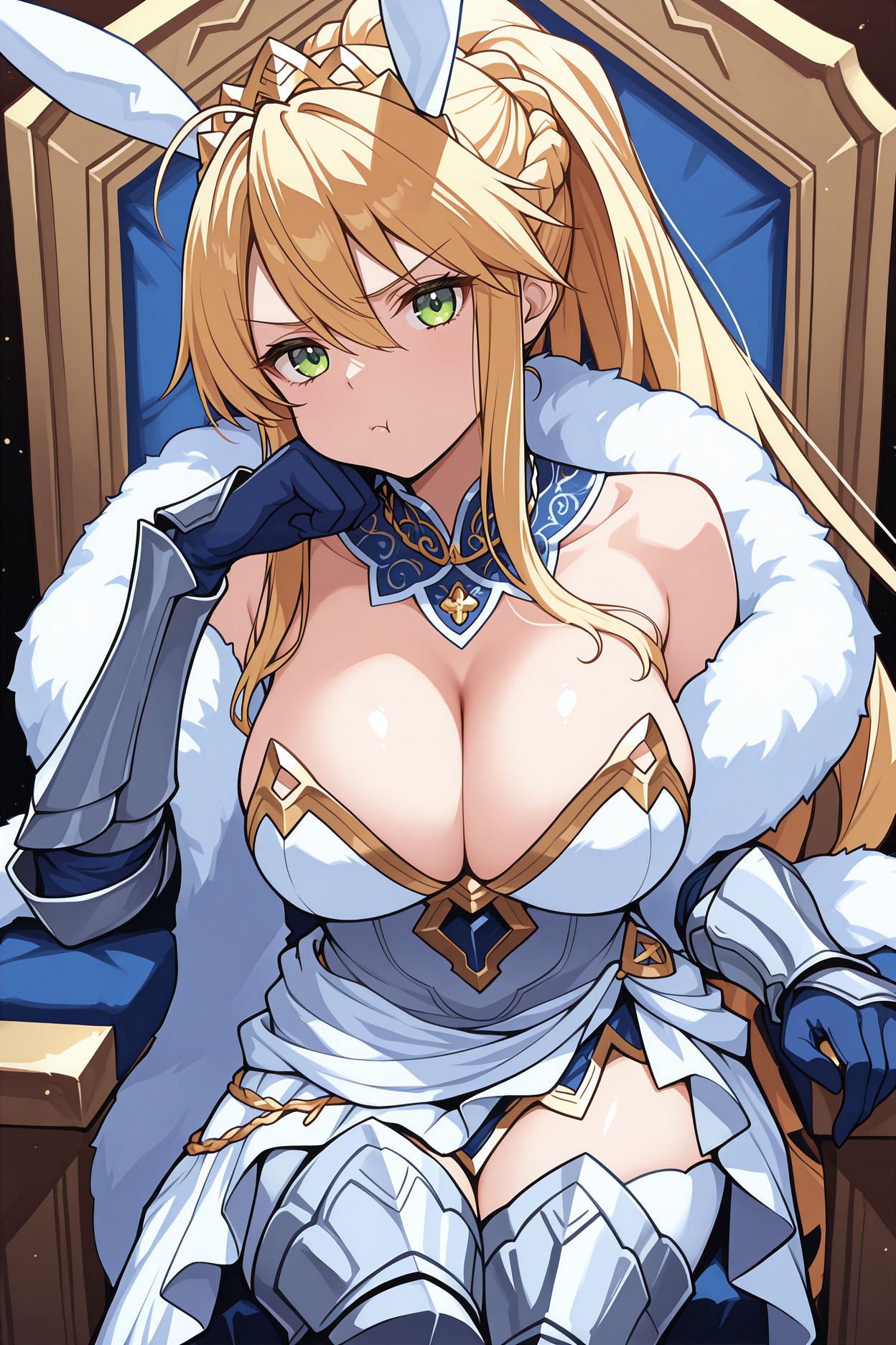 第三阶觉醒:添加 "3aatrl, 金色头发, 侧发, 法式编发, 头发位于双眼间, 天线发, 绿色眼睛, 高马尾, 极长发, 金冠, 假动物耳朵, 兔子耳朵, 蓝色衣领, 蕾丝衣领, 白色连衣裙, 无肩带连衣裙, 羽毛围脖, 胸部暴露, 护腕, 蓝色手套, 白色秀场裙, 装甲腿饰, 白色过膝袜"。
