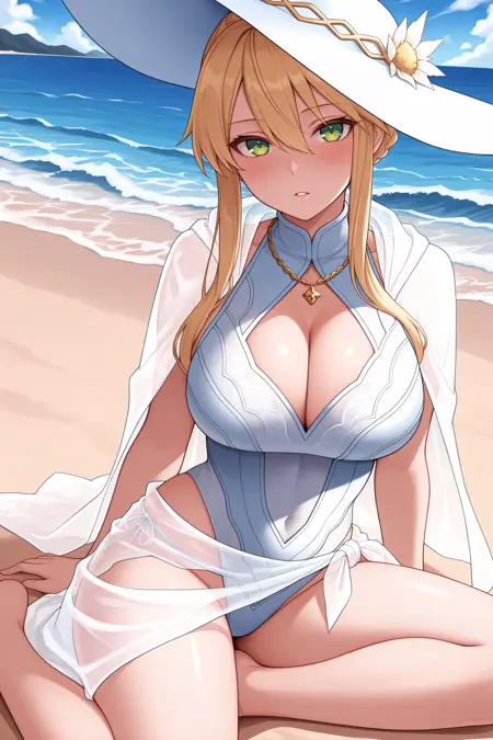 2단계 각성: "2aatrl, 금발, 옆머리, 프렌치 브레이드, 눈 사이 머리카락, 녹색 눈, 선허트, 네크리스, 흰 원피스 수영복, 흉부 커팅, 반투명 카페트, 반투명 사롱" 추가.
