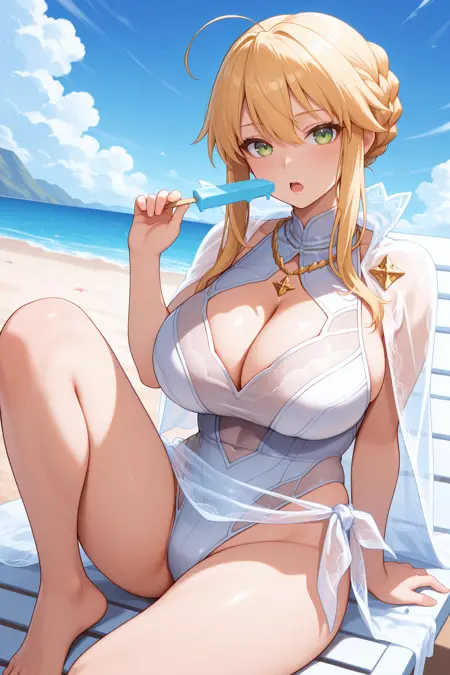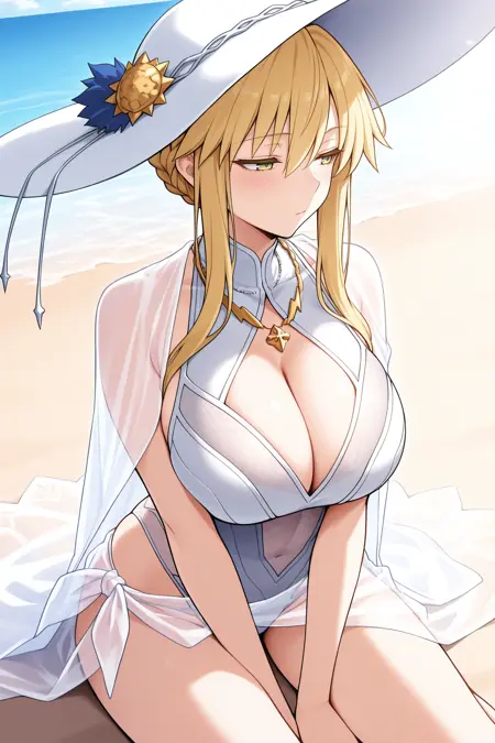 Add "2aatrl, blonde hair, sidelocks, french braid, hair between eyes, green eyes, sun hat, necklace, white one-piece swimsuit, cleavage cutout, see-through capelet, see-through sarong" for her 2nd Ascension.