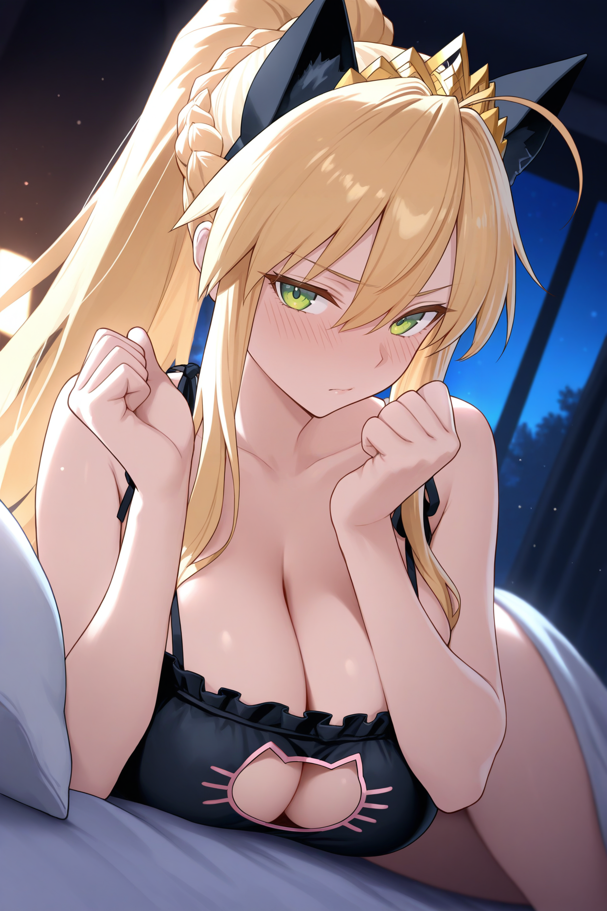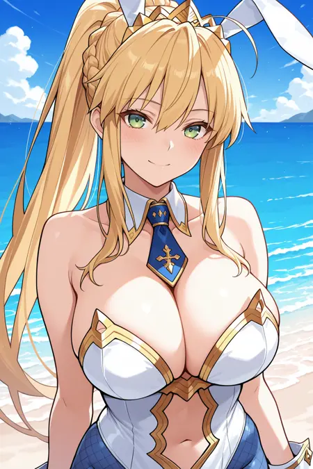 Add "3aatrl, blonde hair, sidelocks, french braid, hair between eyes, ahoge, green eyes, high ponytail, very long hair, gold tiara, fake animal ears, rabbit ears, blue collar, lace collar, white dress, strapless dress, feather boa, cleavage, gauntlets, blue gloves, white showgirl skirt, armored legwear, white thighhighs" for her 2nd Ascension.