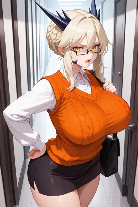 트리거 단어는 "laltartr"이며, "빛나는 금발, 프랑스식 땋은 머리, 눈 사이의 머리카락, 옆머리, 노란 눈, 뿔"이 필수입니다.