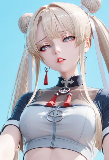 灰色短上衣,透视上衣,红色流苏,拉链,圆形拉链头,短袖,黑色腰带,腰带扣,灰色超短裙,白色腰包,白色大腿镂空小丑裤,灰色腰披,红色袜子,黑色厚底高跟鞋,