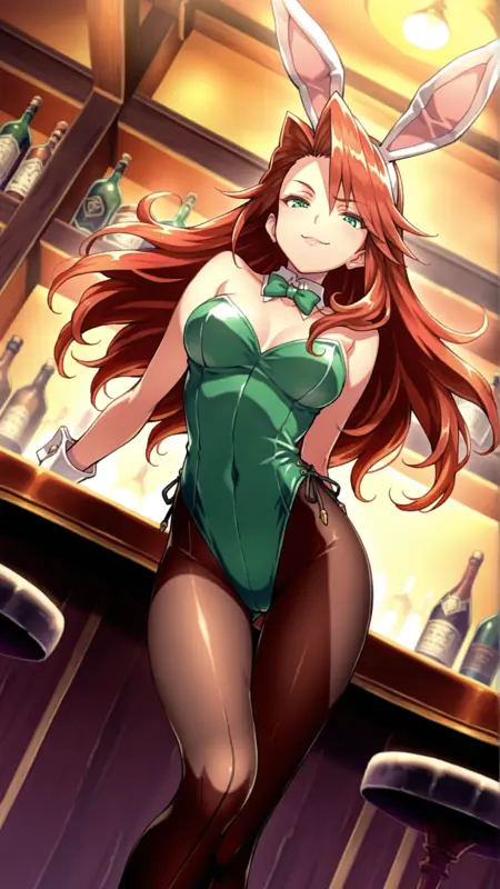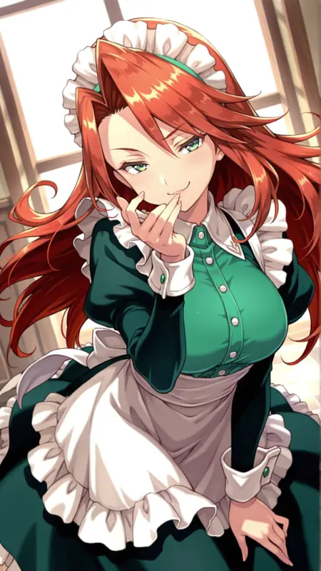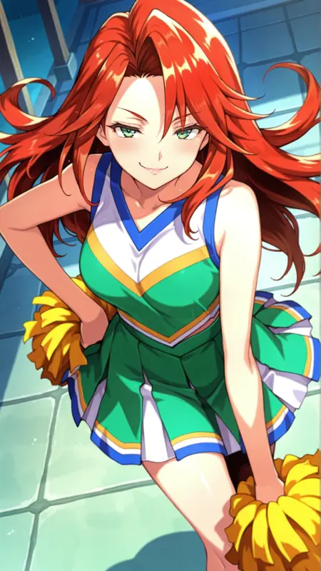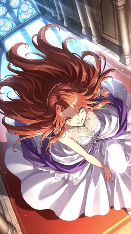 외모: 긴 머리, 녹색 눈, 붉은 머리,