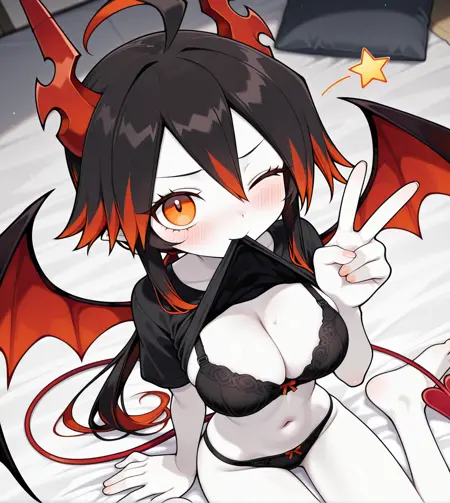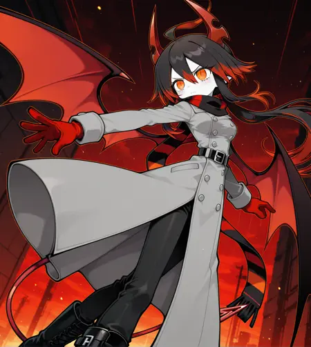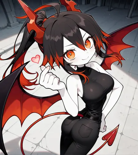 ivlin,red horns,red demon tail,white pale skin,black hair,ahoge,thin long ponytail,orange eyes,two-tone hair,red hair,multicolored bat wings,red and black bat wings,