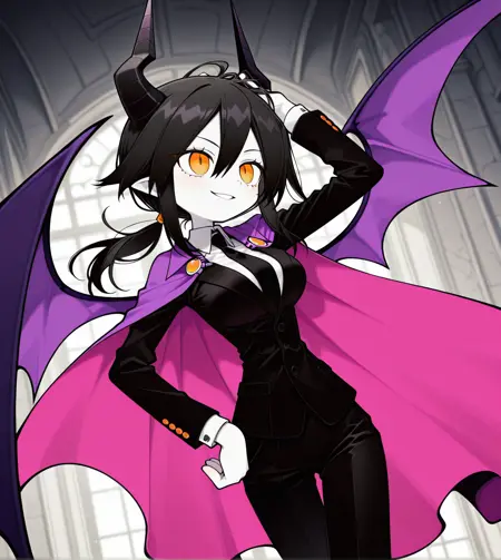 satanicka,black hair,demon horns,demon wings,low ponytail,orange eyes,pink cape,pointy ears,purple wings,wings,yellow eyes,black nails