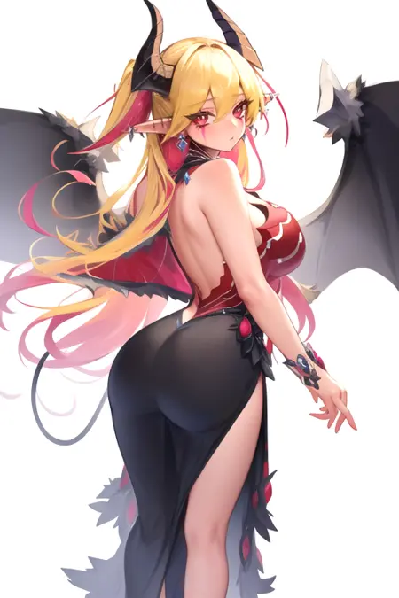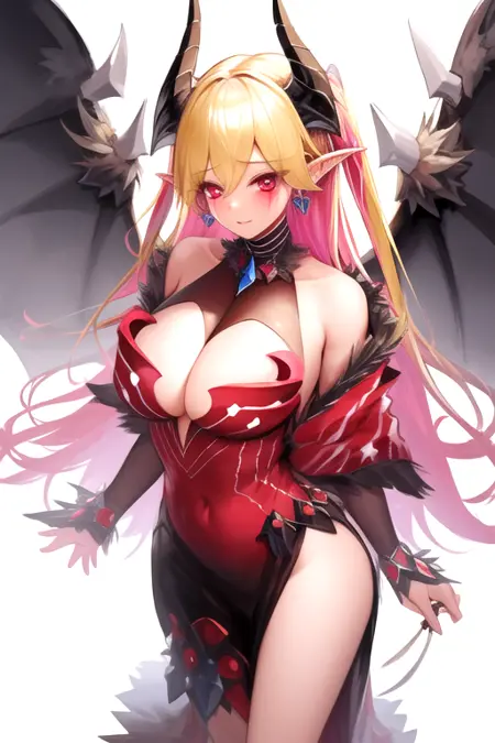 更多标签以确保获得完整效果:金发、珠宝、角、恶魔女孩、耳环、头发遮住眼睛、翅膀、尖耳、红眼、多色发、粉发、大胸部、服装镂空、面部纹身