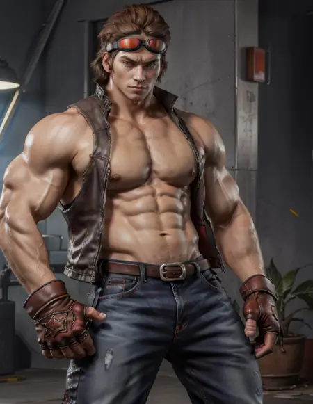 标签:Hwoarang_Tekken, 单人, 棕色头发, 一男, 男性焦点, 腰带, 裤子, 无指手套, 背心, 肌肉发达, 眼镜戴在头上, 牛仔裤, 头发向后梳