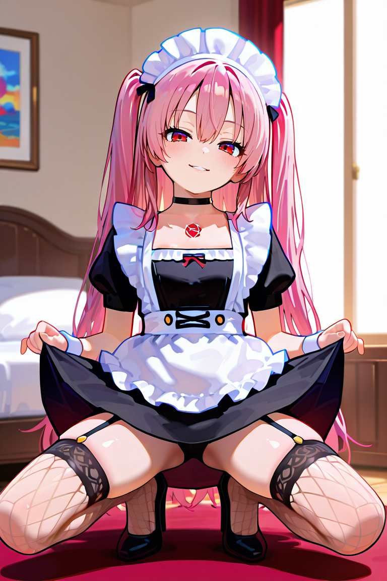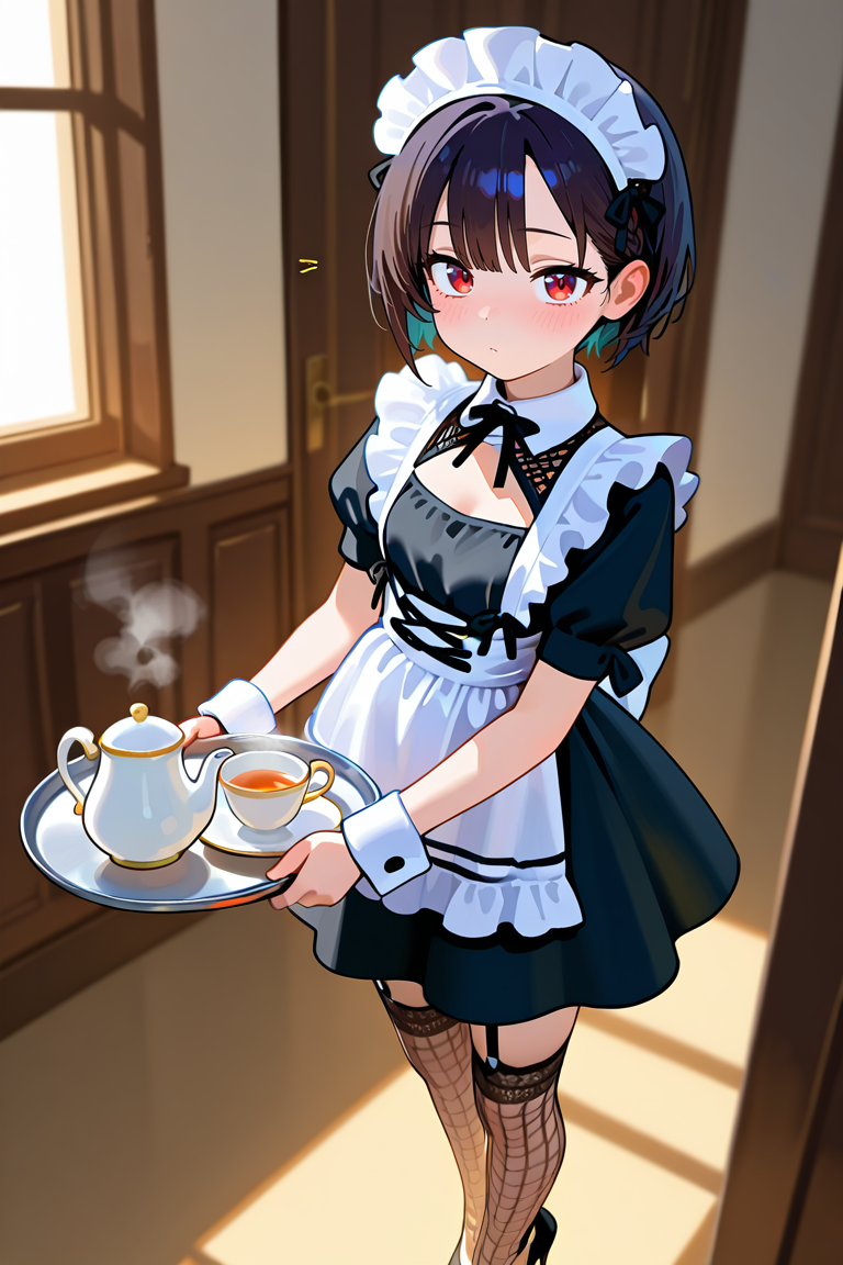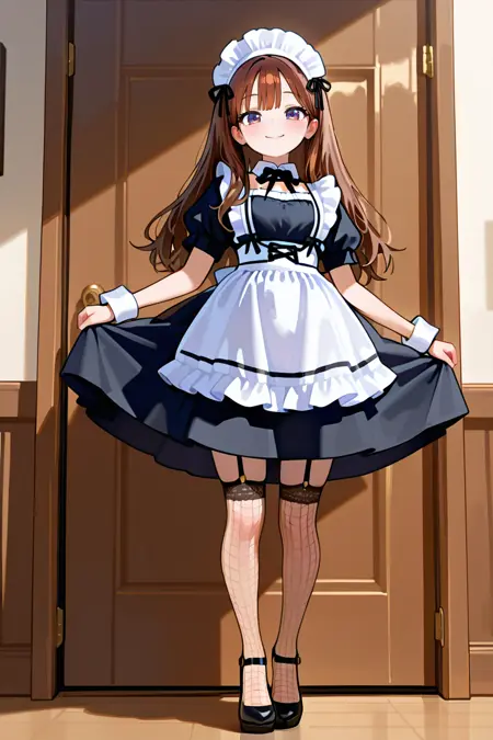 LoRAなしでかわいいメイドの衣装を生成することは可能ですが、このモデルはより一貫したまとまりのあるデザインを提供します。特に、ルックの一部としてフィッシュネットのタイツを特徴としています。