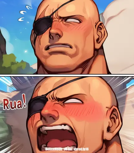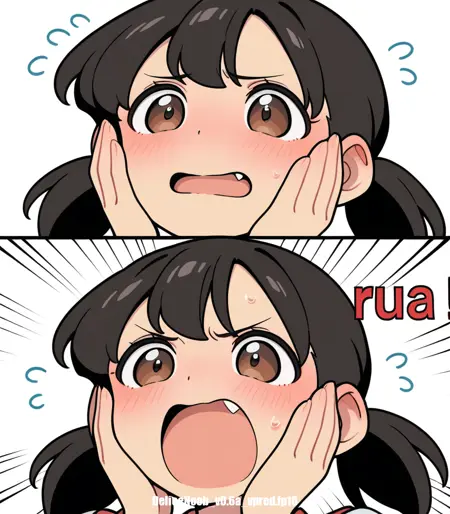 rua \(meme\)、英語テキスト "rua"、2コマ、強調線、飛び散る汗、頬紅、$charaname$