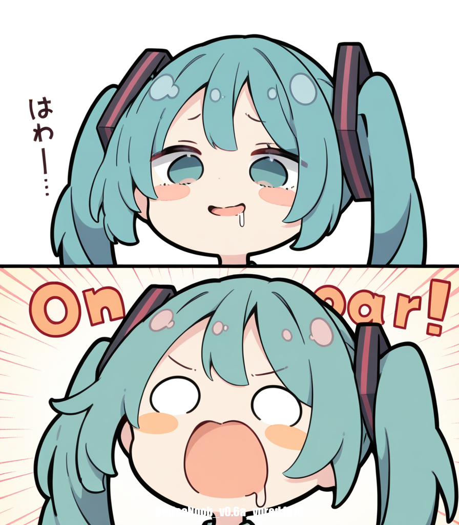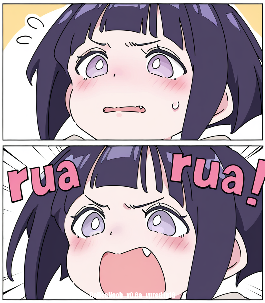 rua \(meme\)、チビスタイル、2コマ、飛び散る汗、強調線、英語テキスト:"rua"、牙、シンプルな背景、白い背景、アップ、下から見た視点、$charaname$