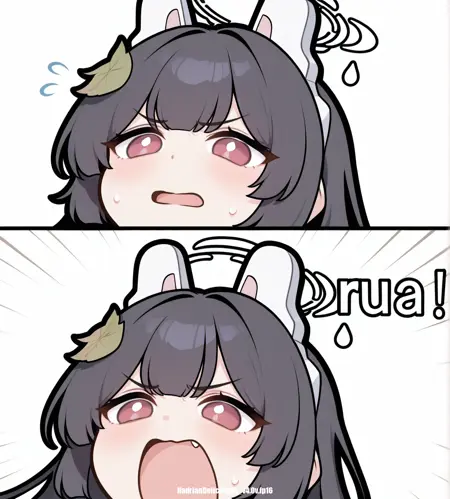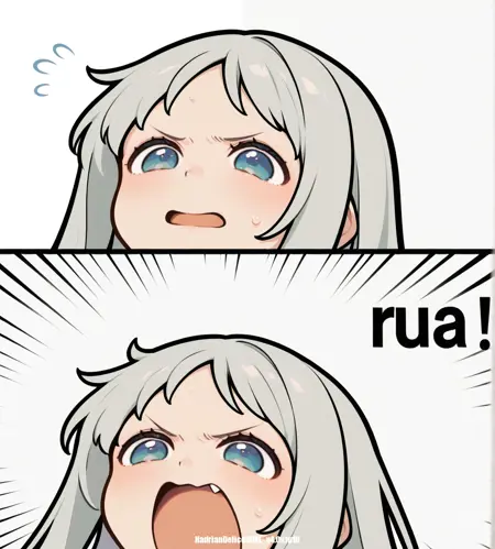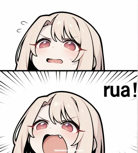 rua \(밈\), 치비 스타일, 2코마, 날아다니는 땀방울, 강조선, 영어 텍스트: "rua", 송곳니, 단순한 배경, 흰색 배경, 클로즈업, 아래에서 올려다보는 시점, $charaname$,