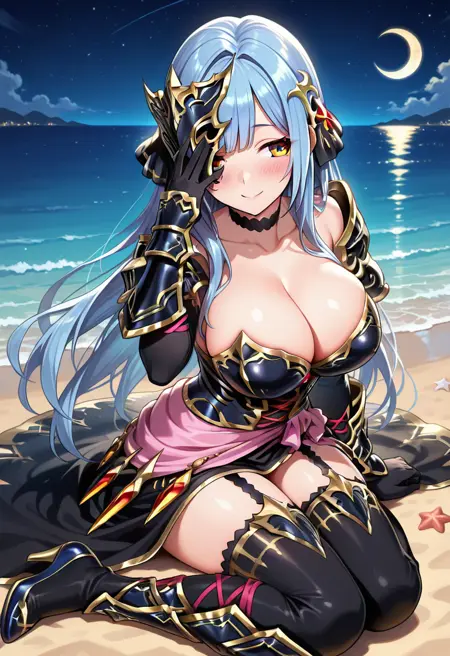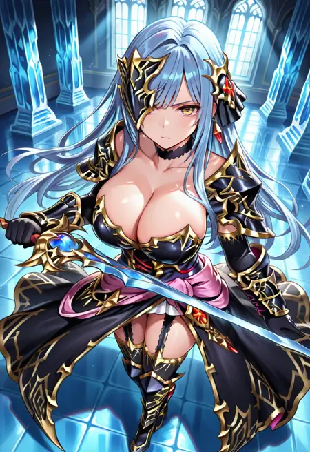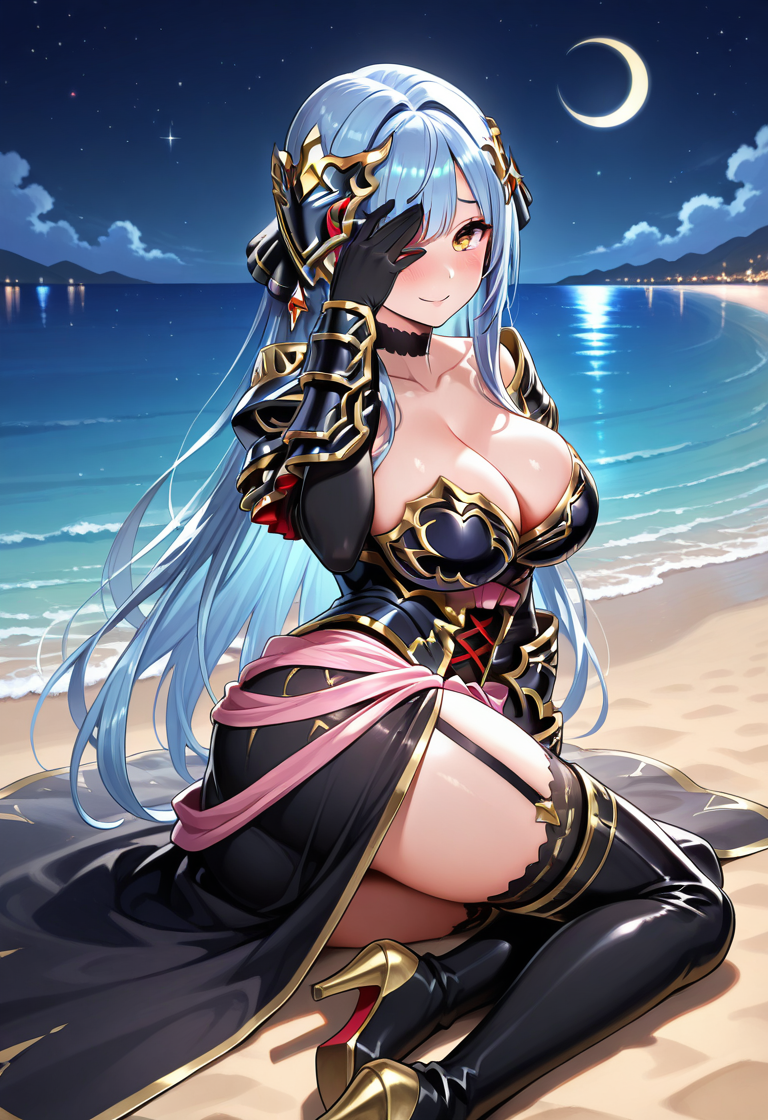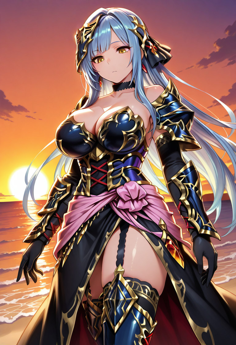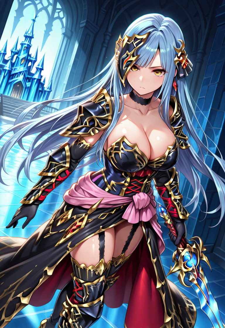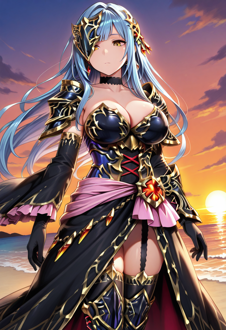 iris_(brave_frontier), 1girl, solo, 성숙한 여자, 파란 머리, 노란 눈, 머리 장신구, 초커, 클라비클, 가슴, 검은 드레스, 분리된 소매, 팔꿈치 장갑, 갑옷 드레스, 검은 허벅지 양말, 하이힐, 허벅지 부츠, 가터 스트랩, 장갑, 어깨 갑옷