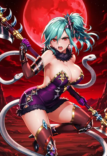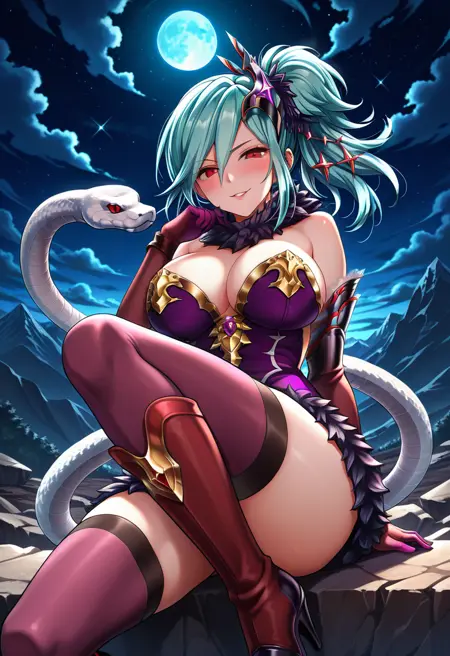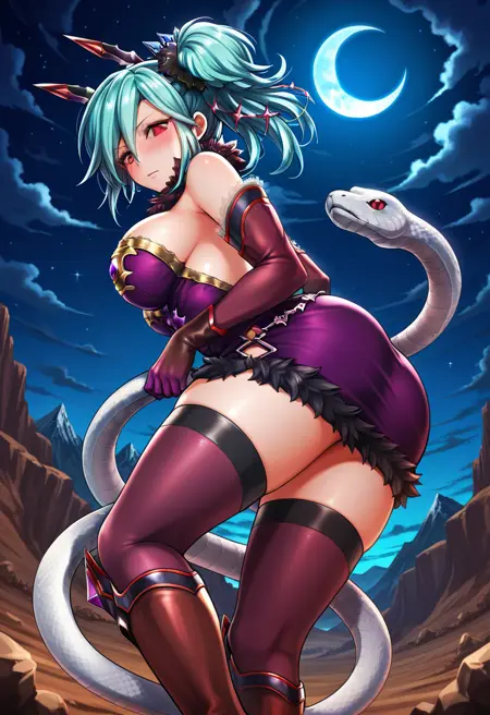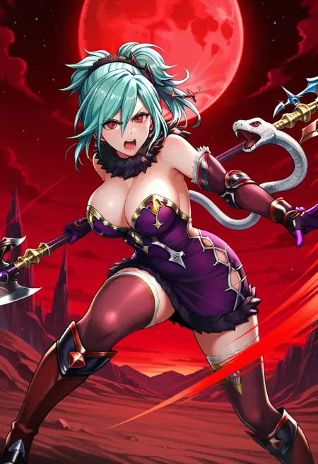 kafka_(brave_frontier),1girl, solo, 아쿠아 헤어, 눈 사이의 머리카락, 빨간 눈, 꼬리머리, 사이드 포니테일, 보라색 드레스, 모피 장식 드레스, 머리 장식, 어깨 노출, 모피 칼라, 팔꿈치 장갑, 무릎 부츠, 하이힐 부츠, 허벅지까지 오는 양말,